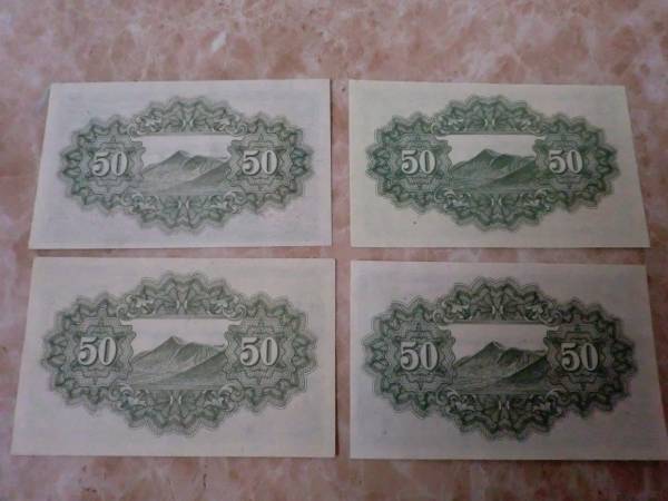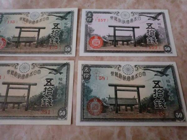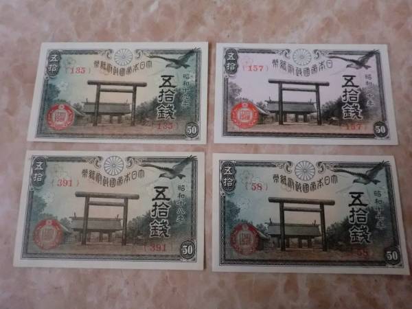 政府紙幣 靖国50銭 の17年・18年・19年・20年の4枚で未使用・極美品です。
