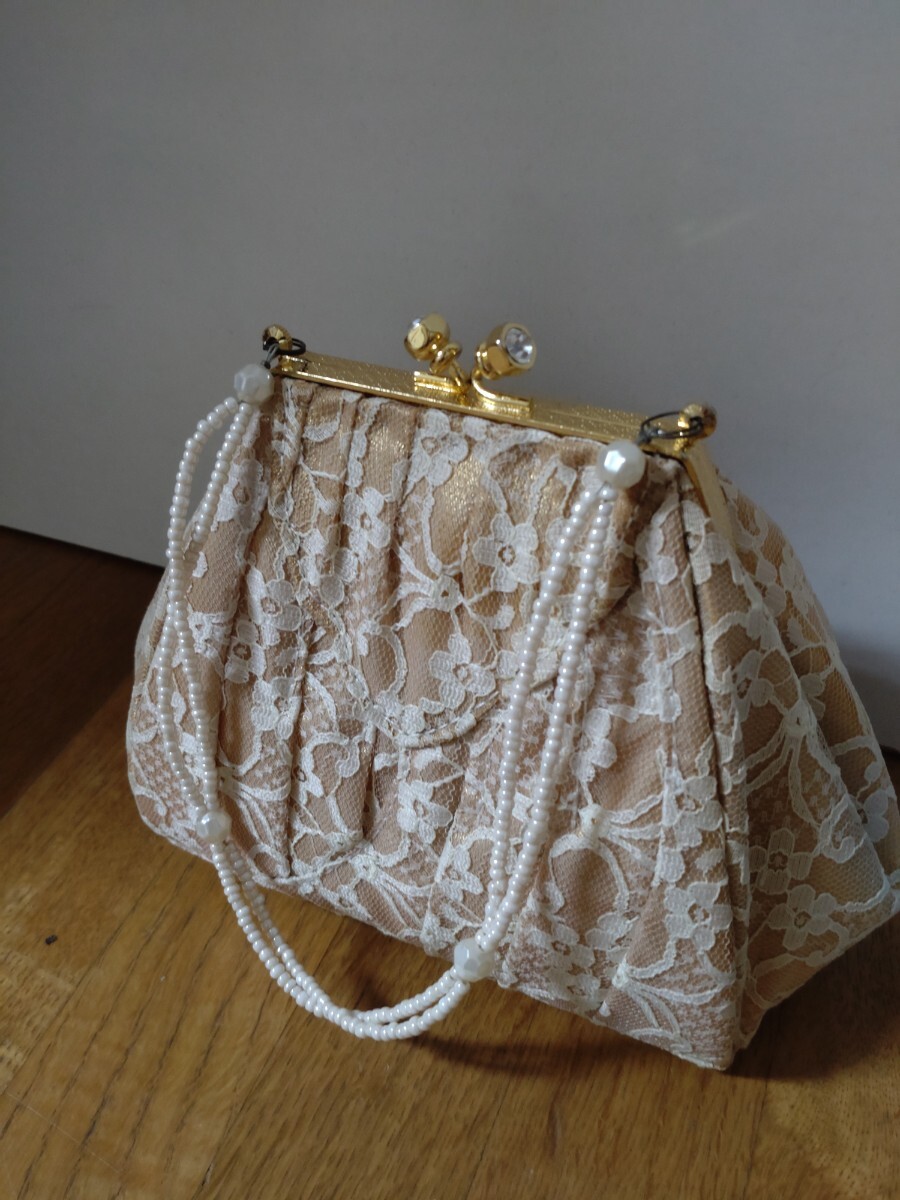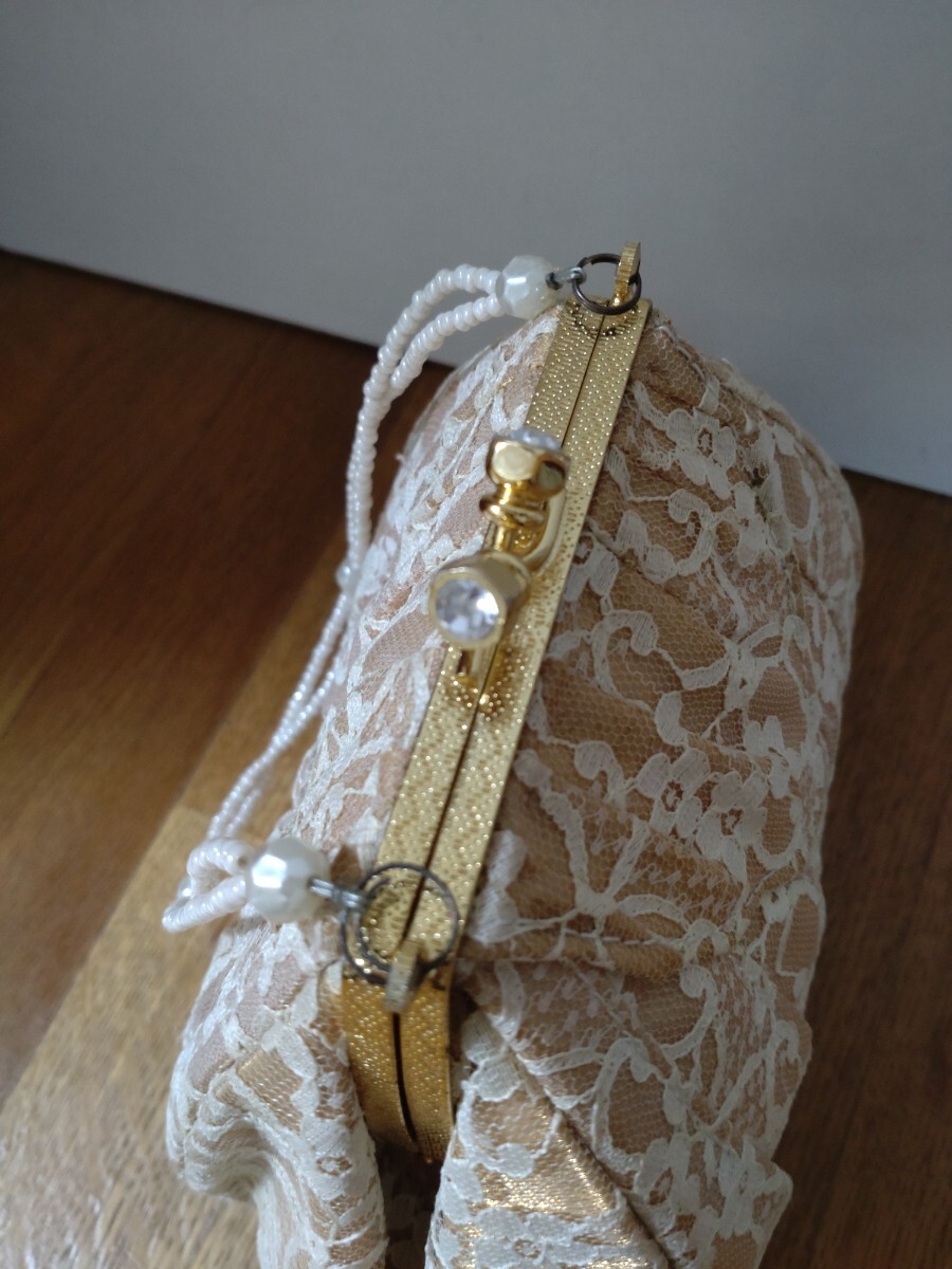 LAPIS BEAMS がま口 レース パーティバック 1回使用 シャンパンゴールドにレースを重ねた、レトロなデザインのがま口バッグです。 がま口のつまみに、ラインストーンが入っています。 ビーズの持ち手が付いています。 ドレスだけでなく、お着物、袴などの和装にも可愛いです。