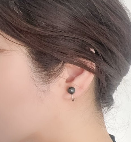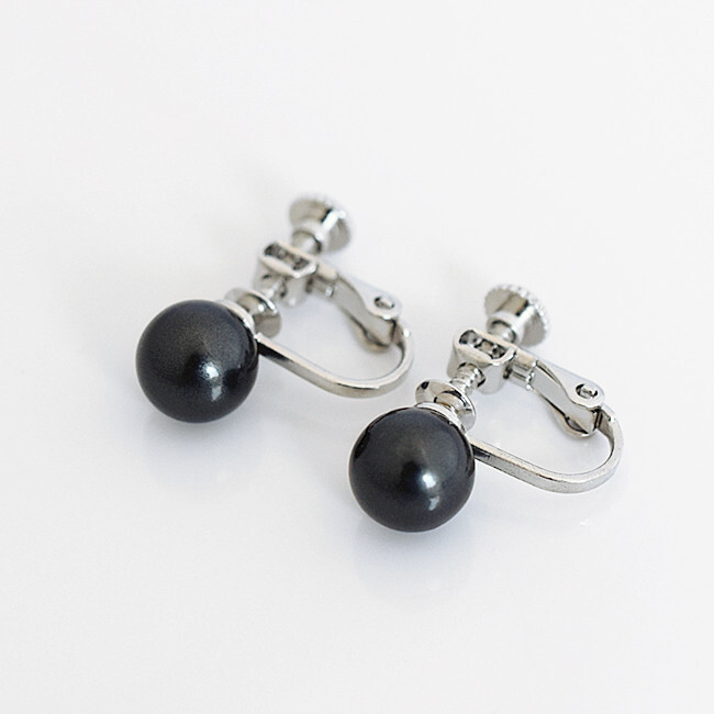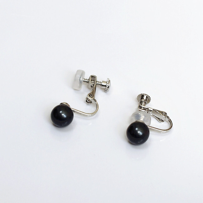 ●金属素材:真鍮。ロジウムメッキ。●イヤリングサイズ:縦1.6X横0.8cm。●パール素材:貝パール。直径約8mm。●色:ブラック。●耳にあたる部分はシリコンゴム1組(1組2個セット)付き。ソフトにフィットします。