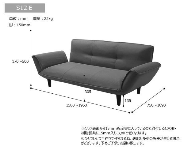 【サイズ】 サイズ:幅1580~1960x奥行き750~1090x 高さ170~500x座面の高さ170 (脚なしの場合) 【素材】 構造材:スチールパイプ クッション材:ウレタン モールド成型 コイルスプリング 脚:樹脂脚 背と肘は5段階でリクライニングします。 【製造国】日本製 脚は樹脂脚150mmです。 | ||