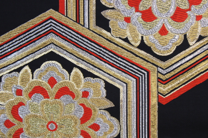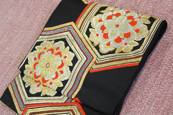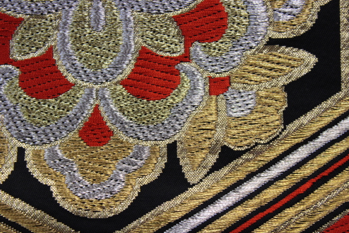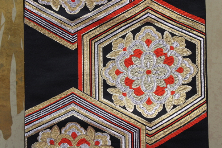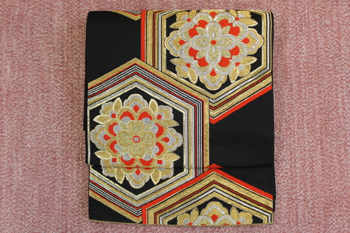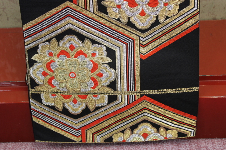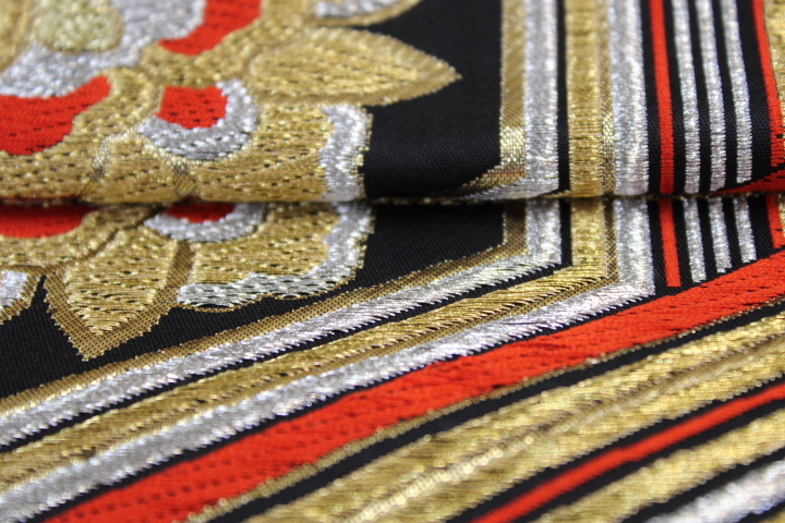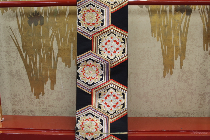 西陣織 袋帯錦織 黒地に金亀甲に赤縁取り 中華文柄入り