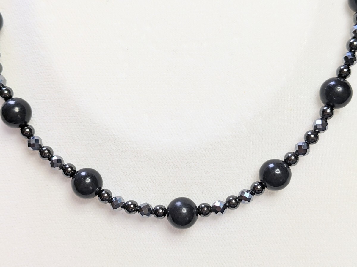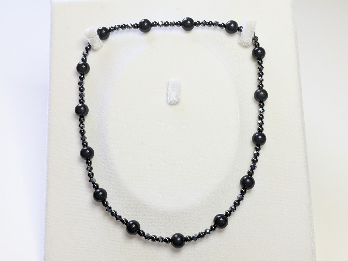 シュンガイトと磁気ヘマタイトを使用したストレッチ・ネックレスです。