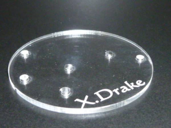 素材はアクリル板、3ミリで文字もレーザーで彫ってあります。純正の台座は場所をとったりジャマになったりしますが、これだと見た目もキレイにスッキリ並べられます。
