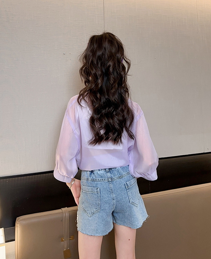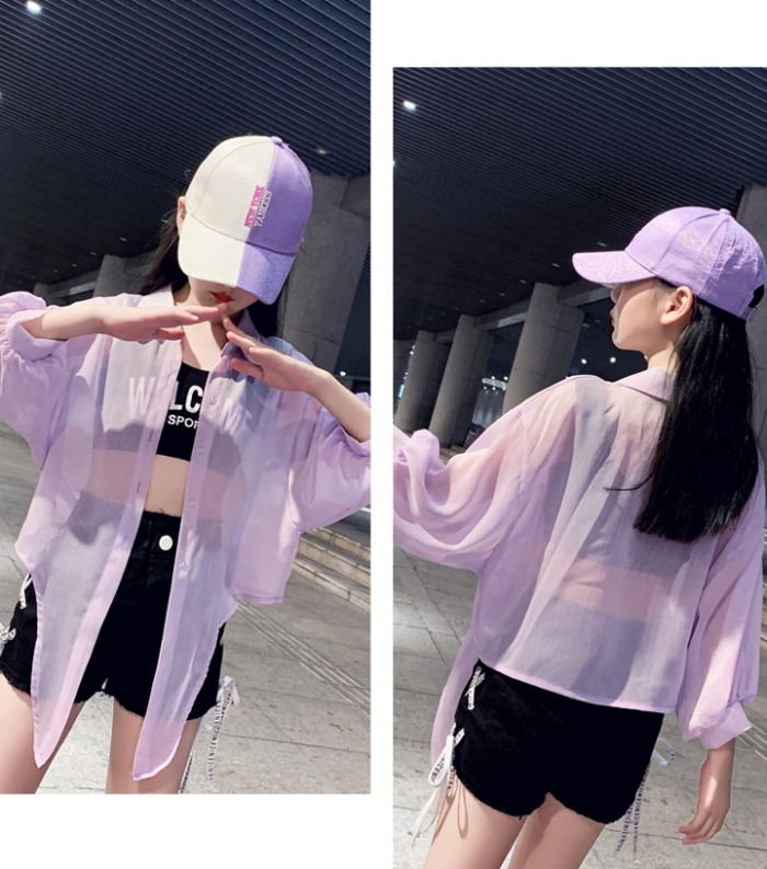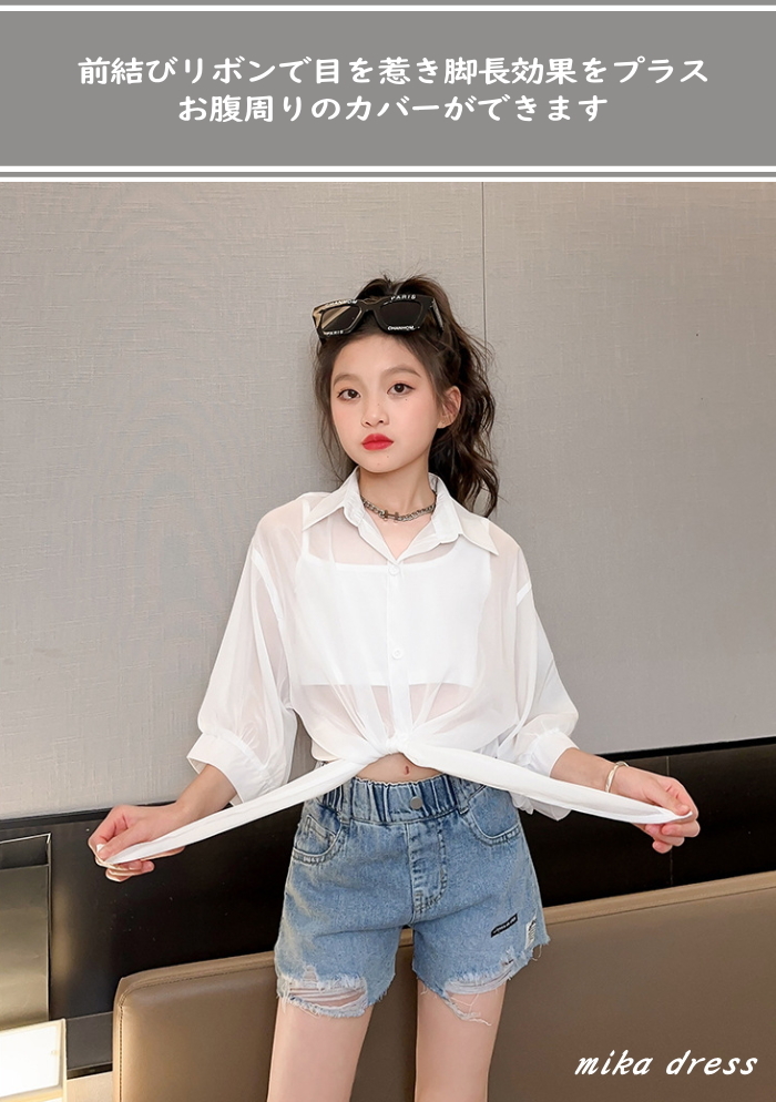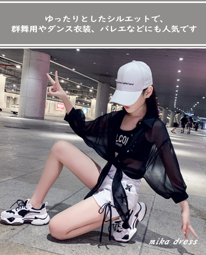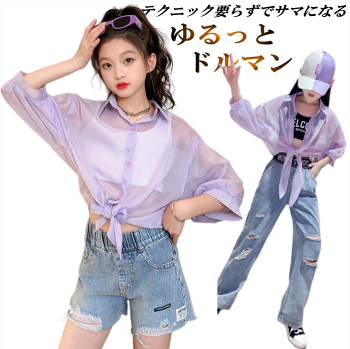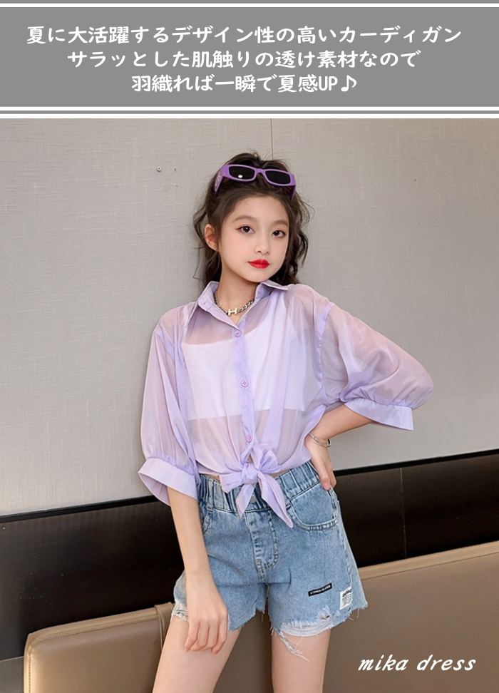キッズダンス シアー トップス【パープル】ダンス 衣装 女の子 前結び シャツ ボレロ シースルー へそ出し ショート 襟付cy10n-pa