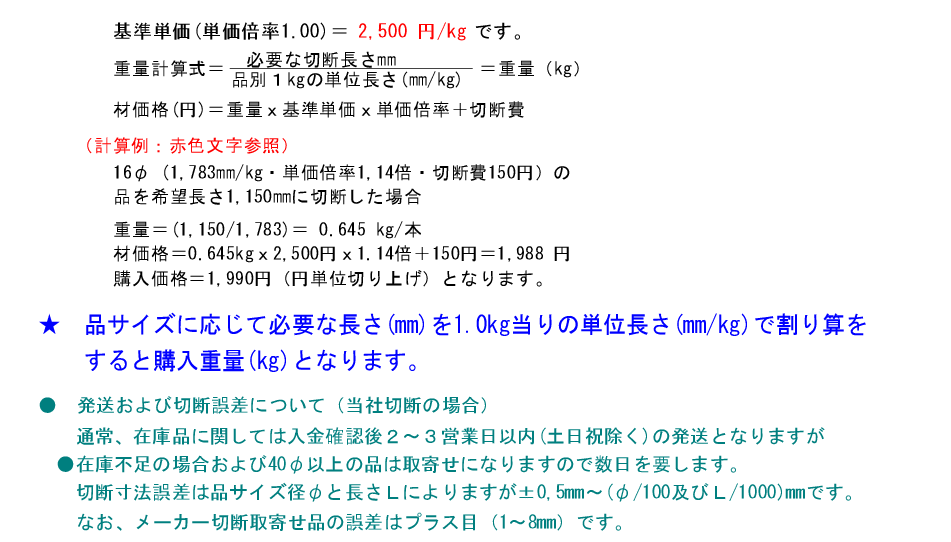 購入価格は希望品形状・任意寸法切断総重量(kg)に準ずる価格となります。