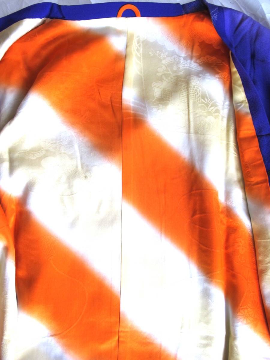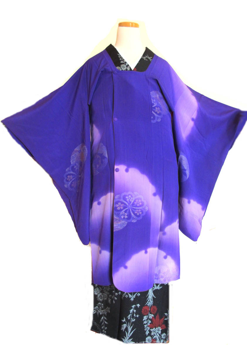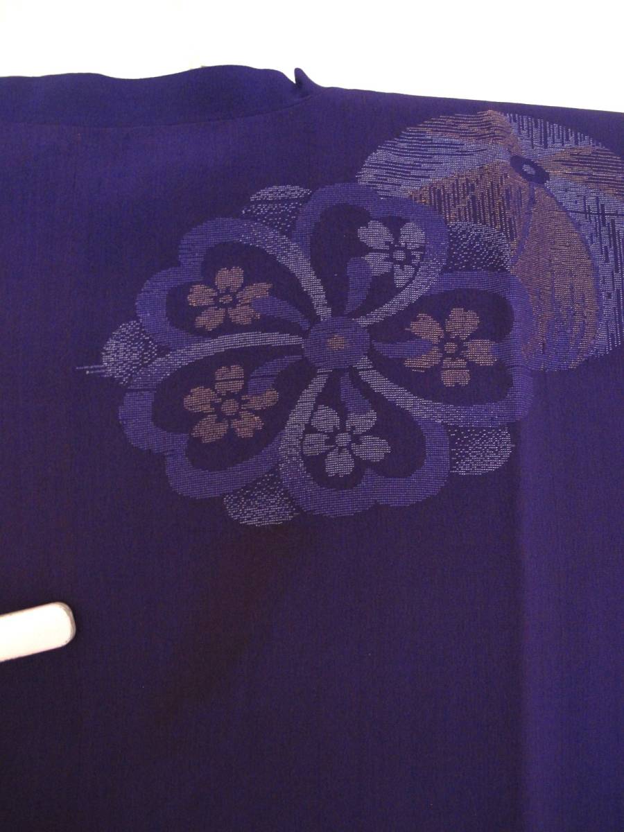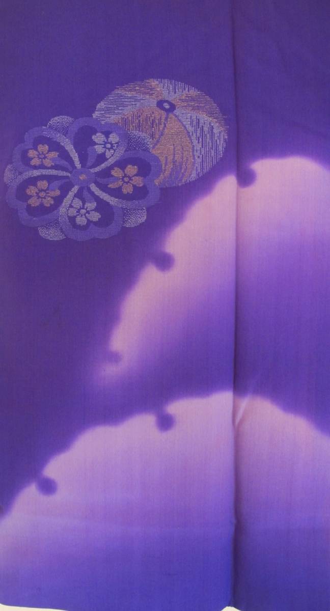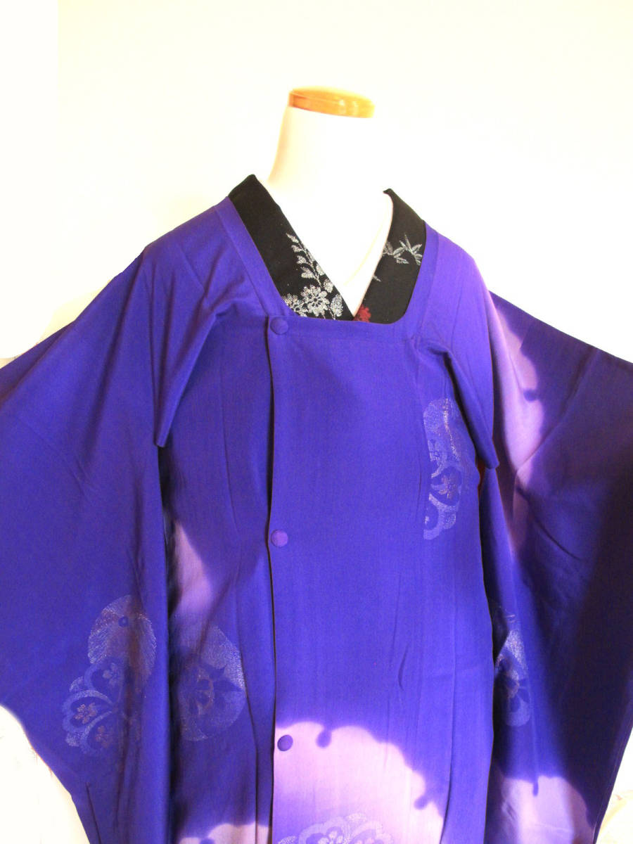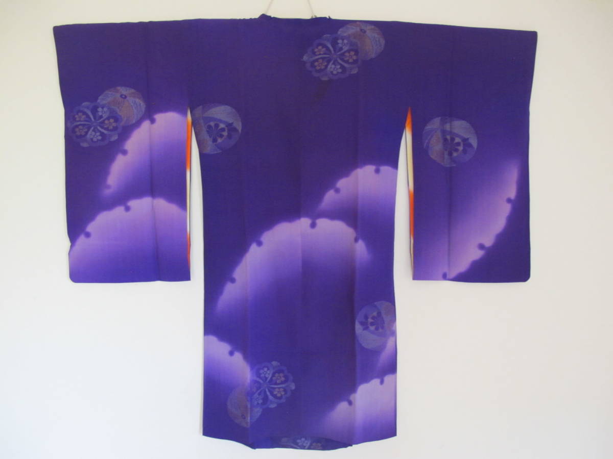 おおよその丈:身丈(肩)108cm、裄62cm、袖丈66.5cm、袖幅32.5cm、前幅21cm、後幅28.5cm 素材:正絹 お色:青紫