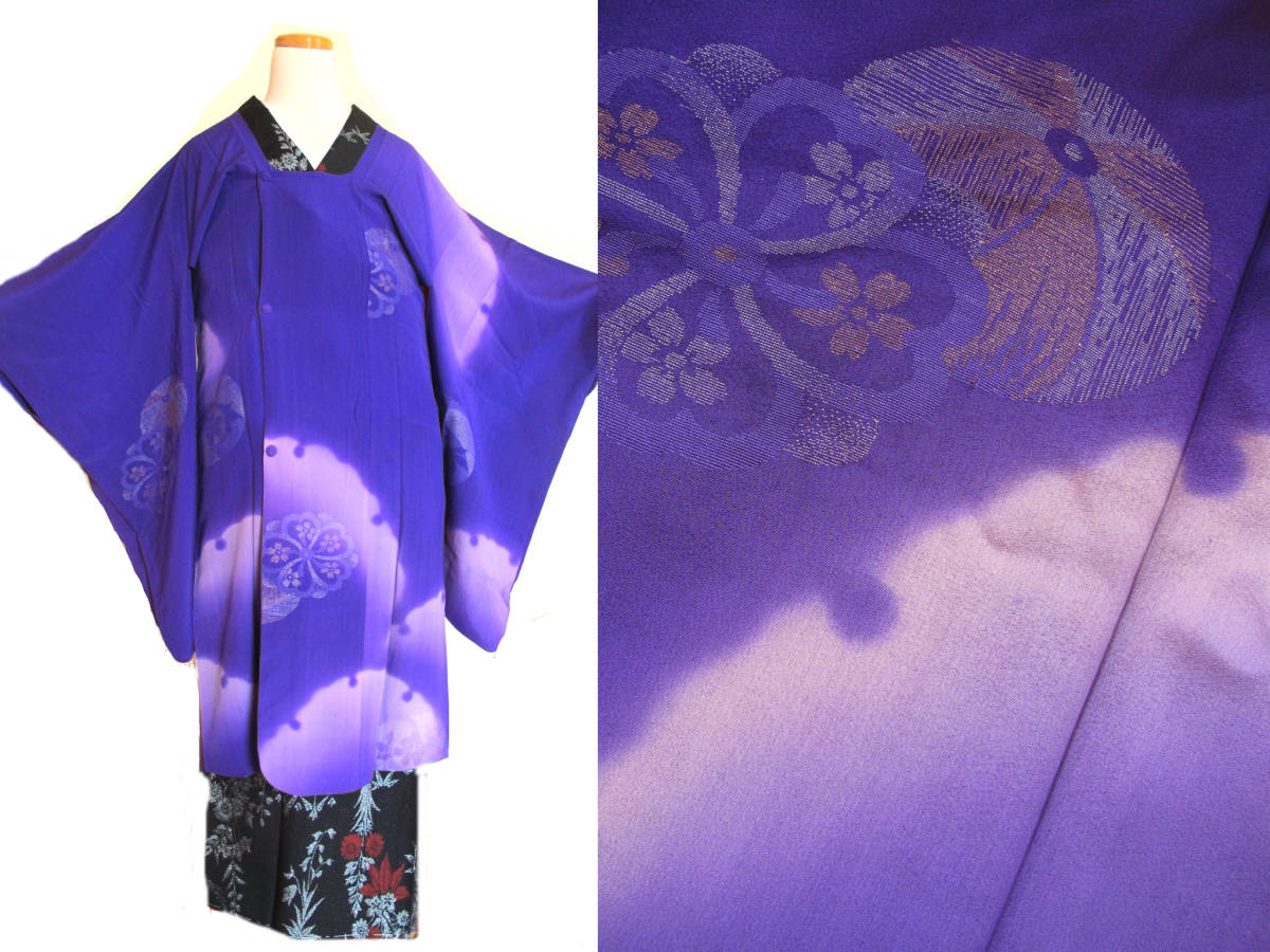 情緒ある雪輪のぼかしに、漆織りの花と毬のアンティーク道行です。 錦紗地です。 |