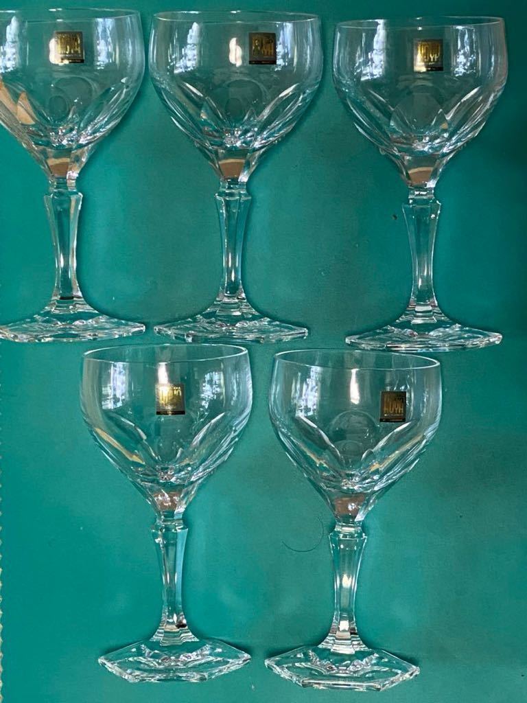 豪華で重厚なホヤの6面カットクリスタルワイングラス5個セットです。大きさは口径約7.7センチ高さ約15センチ。自宅での保管品で未使用です。ヒビや欠け、割れなどの瑕疵は見受けられません。
