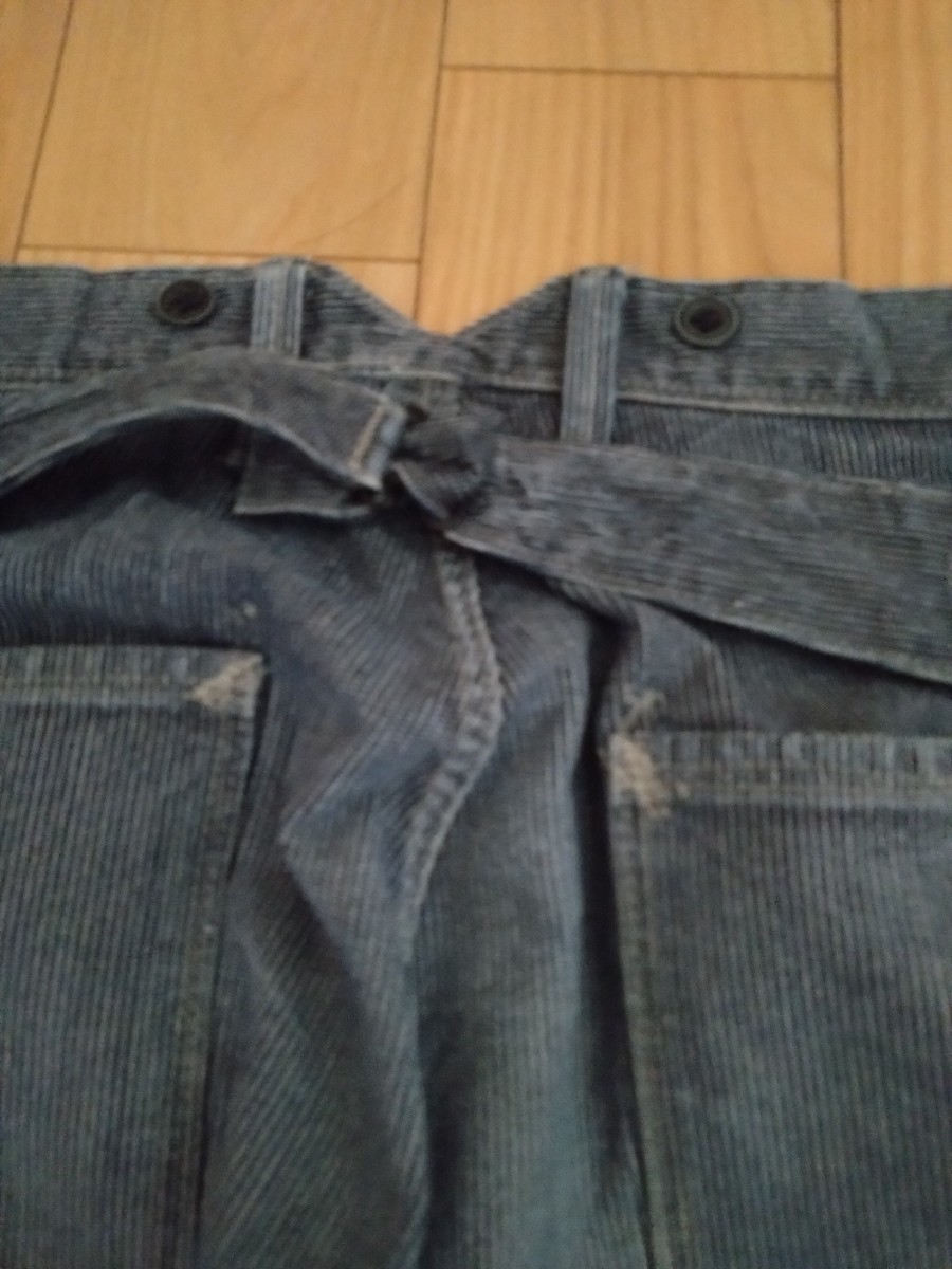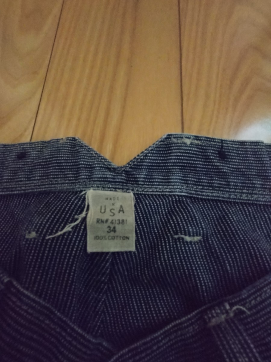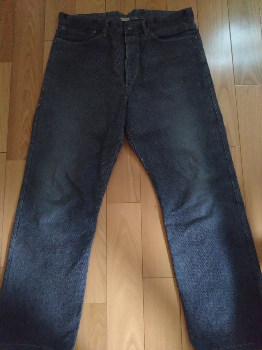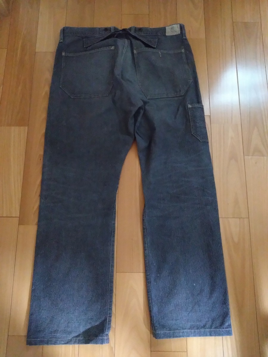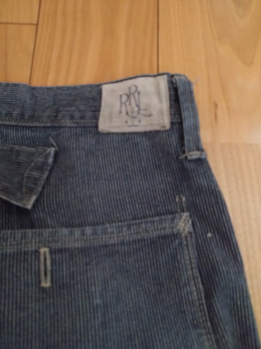 RRLのピンストライプトラウザーパンツです。サイズ表記34で腰幅44cm程度、股下74cm程度です。サスペンダーボタンにバックルバック、と豪華な仕様で何と言ってもビンテージ加工を施したネイビーの生地にホワイト系のピンストライプが最高にカッコいいです。RRLのストライプトラウザーはたまに見かけますがピンストライプは滅多に出ません。何年も前(おそらく10年以上前)ですがジョニー・デップが着用している画像を拝見しましたので探せば出てくると思います。出品するつもりはなかったのですがあまり出番が無くクローゼットのディスプレイとなっていたので思い切って出品して見ることとしました。裾上げの有無はわかりません。一部ペンキ後のような物がありますがこれは元からの加工です。本当に激渋のRRL全盛期のお品です。神経質な方や完璧な物をお求めの方は入札しないで下さい。よろしくお願いいたします。