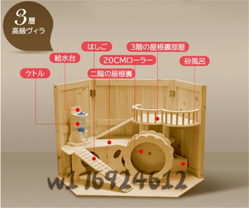 飼育ケージセット:本体、ステージ×4、スロープ、ロフト、給水ボトルボルダー 組立て式:約30分(自宅組立て) 材質:天然木