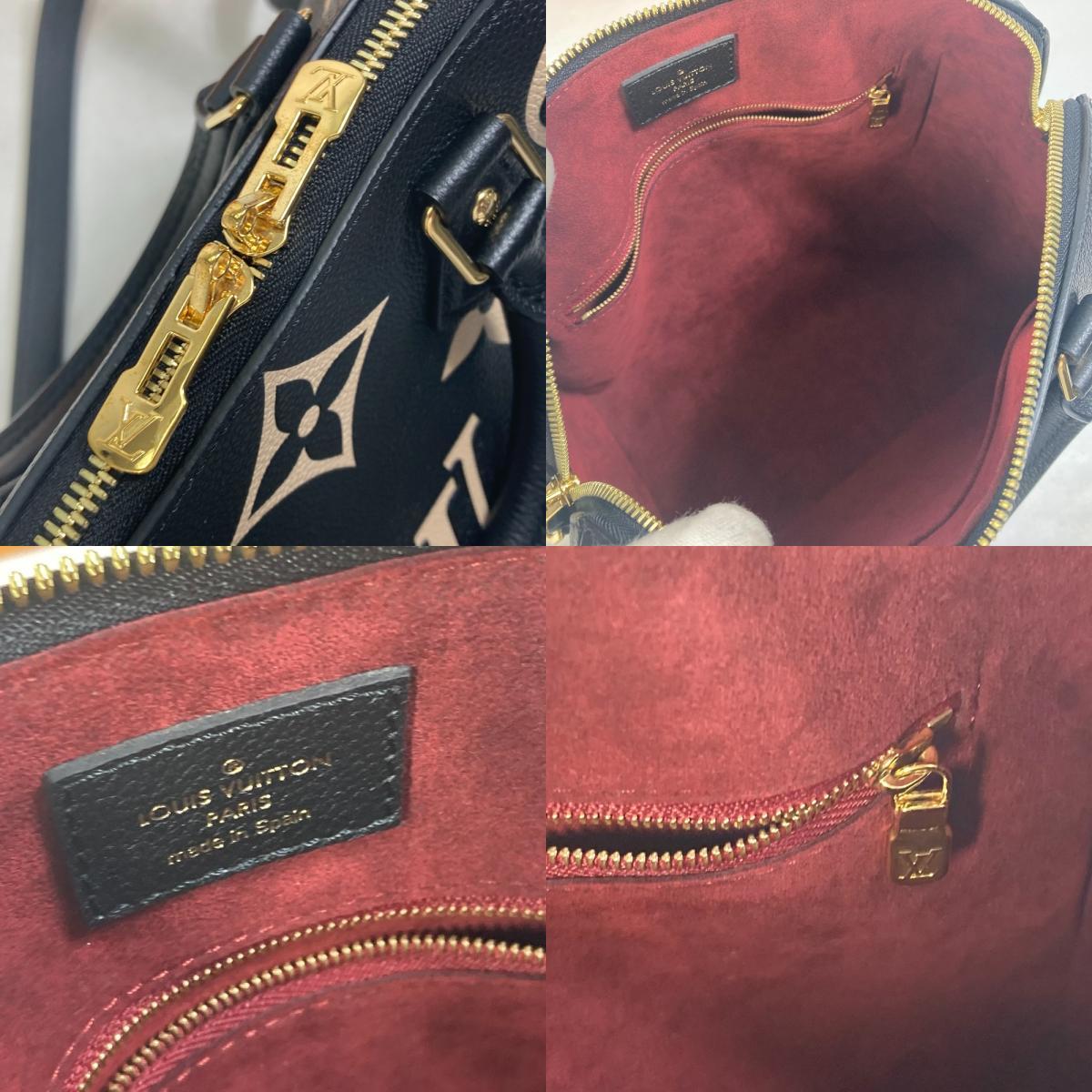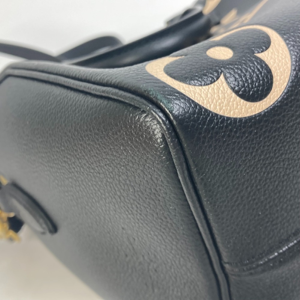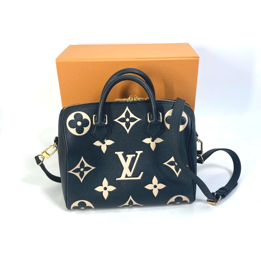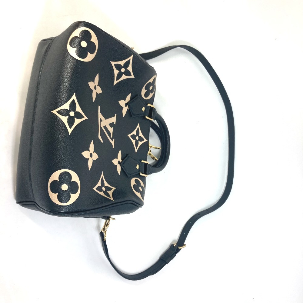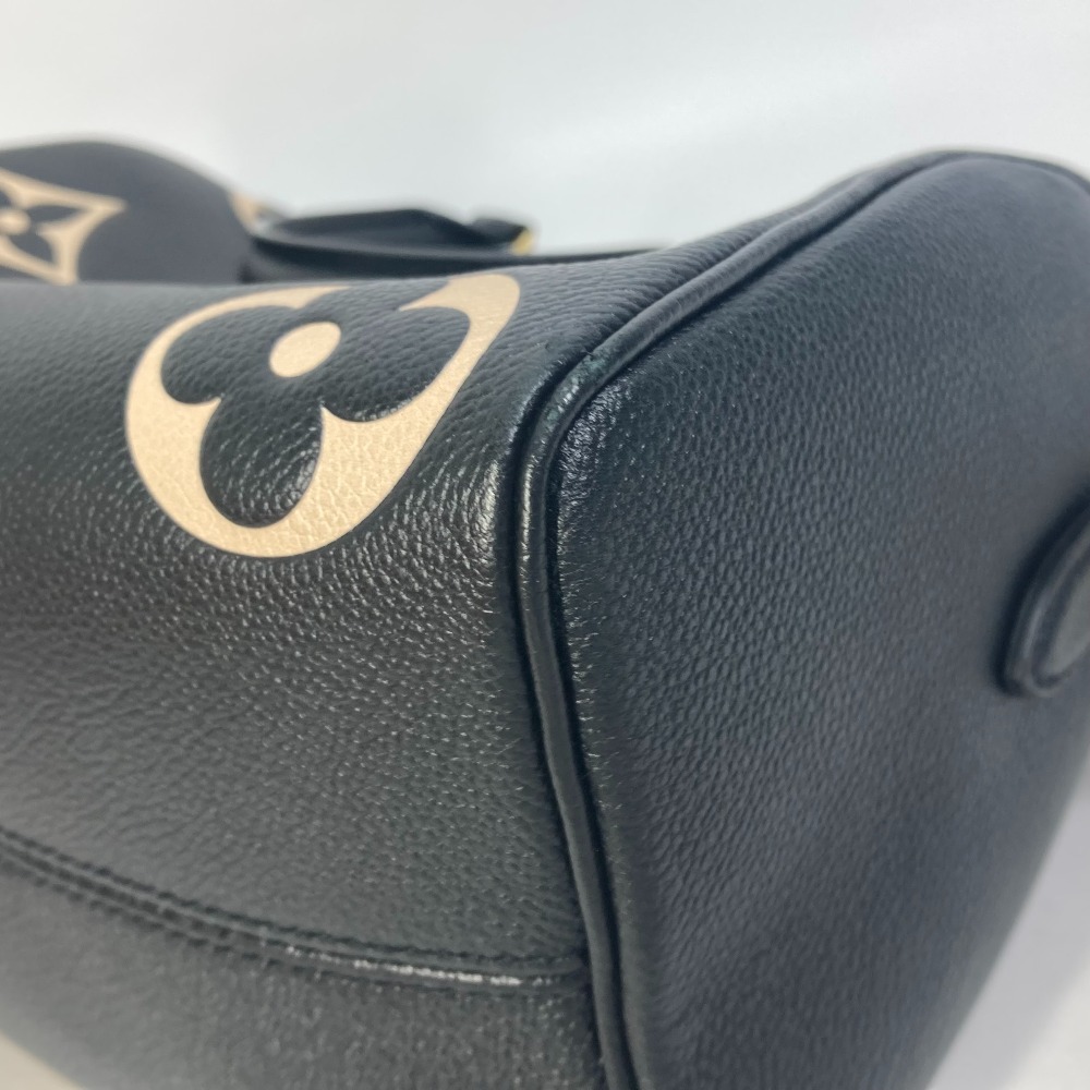 商品説明ベージュのモノグラム・ジャイアント パターンをエンボス加工で施した、ブラックのモノグラム・アンプラント レザーで仕立てた「スピーディ・バンドリエール 25」。