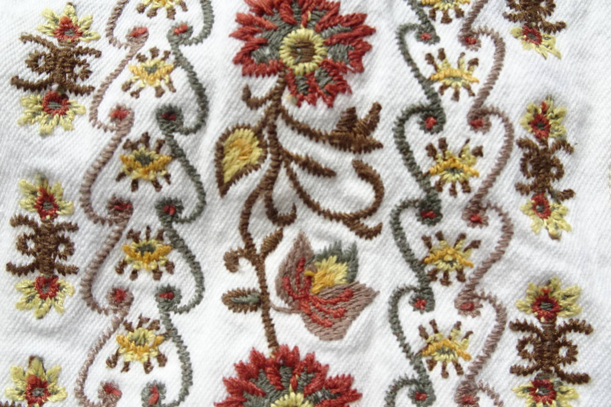 前身頃は茶系の花柄、チロリアン柄ししゅう入りです。