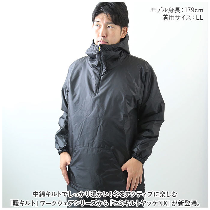 | 商品説明 | ・・中綿キルトでしっかり暖かい!冬をアクティブに楽しむ「暖キルト」ワークウェアシリーズから「セミキルトヤッケNX」が新登場。 ・【抜群の保温性×ソフトな着心地】 ・ボディの身頃部分とフード裏面に中綿キルト素材を使用した、軽くて暖かな防寒ヤッケ。通常のキルティング加工とは異なり、縫い目を造らず中綿がふき出さない「高周波圧着ダイヤキルト」を採用。 ・【ふんわり、ぽかぽかの暖かさ】 ・キルティング生地内側には、ポリエステル綿100%素材をふんわり充填。冷たい木枯らしが吹く日でも、ヤッケの中はぽかぽかの暖かさ。 ・【動きやすさはそのままキープ】 ・袖裏部分にはキルト素材を使用しない一枚生地になっているので、腕の動きが制限されず、着ぶくれしないのが嬉しいポイント。 ・【大開口ファスナーで着脱楽ちん】 ・フードの前立てから胸元まで大きく開く「大開口ファスナー」で、着脱がラクラクできるプルオーバータイプ。 ・【調節できるハイネック+フード】 ・首元の襟部分はハイネックタイプ。ファスナージップをしっかり上げれば冷たい風を防いで保温性が向上。フードのフチも首元のドローコードで調節可能。 ・【身体にピタッとフィット】 ・袖口ゴムと裾の調節コードで、ヤッケが身体にぴったりフィット!手元の動きが邪魔されず、隙き間風も防いでしっかり保温。 ・【便利なカンガルーポケット】 ・ヤッケの前面には、スマホやキーケースなど、普段使いの小物が左右から出し入れしやすいカンガルーポケット付き。 ・【カジュアルスタイルと相性抜群】 ・カジュアルスタイルにあわせやすいデザインと、ネイビー・オリーブ・ブラックのスタンダードなカラー展開。屋外での作業やウォーキング等のフィットネスまで幅広く大活躍。 |