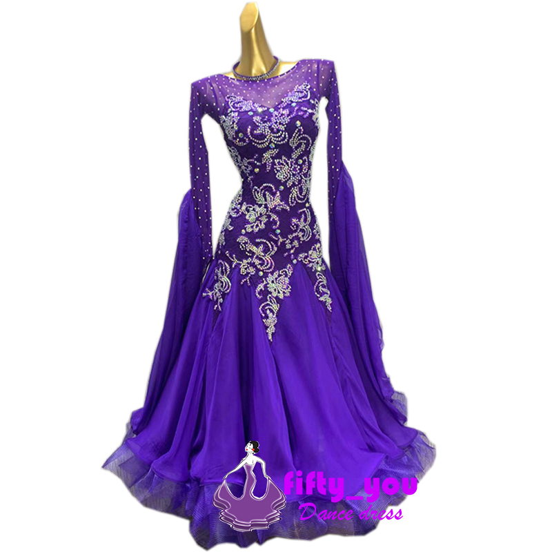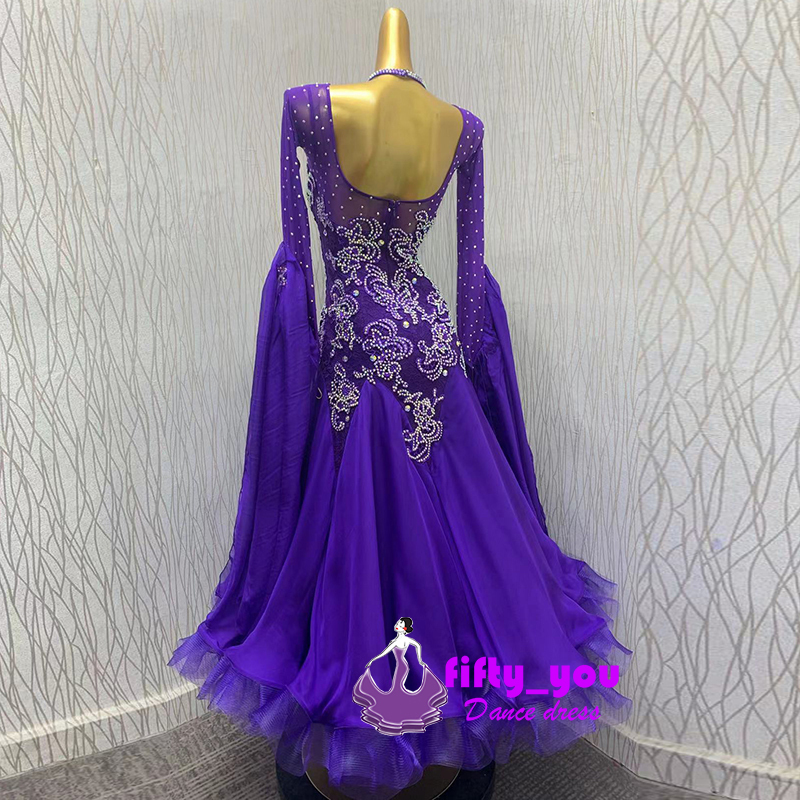 新品fifty_you レディース社交ダンス衣装 競技試合用ダンスワンピース モダンドレス サイズセミオーダー ライトストーン飾 パープル