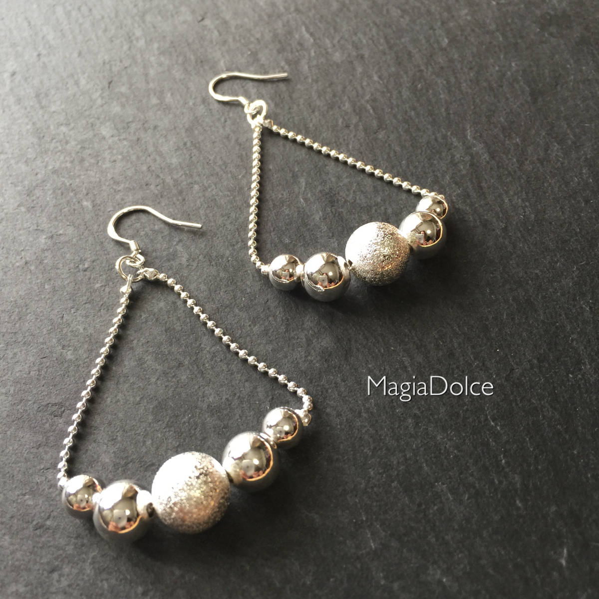 異なるサイズのボールとチェーンがトライアングルのように組み合わされたピアス。