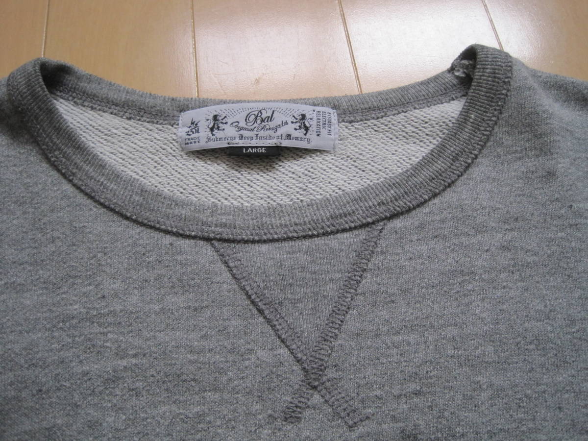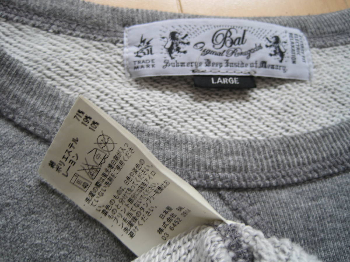 BAL バル スウェットになります。着用感があり、毛羽立ちがあり、写真のような汚れがあります。カラーはグレー、サイズはL、綿71%、ポリエステル19%、レーヨン10%、日本製です。肩幅49cm、袖丈62cm、身幅51cm、着丈64cmです。素人の採寸ですので若干の誤差、商品状態はご了承ください。 落札後は、ノークレーム、ノーリターン、ノーキャンセルでお願いします。発送方法はレターパックです。ほかにも色々出品していますので良かったらご覧ください。