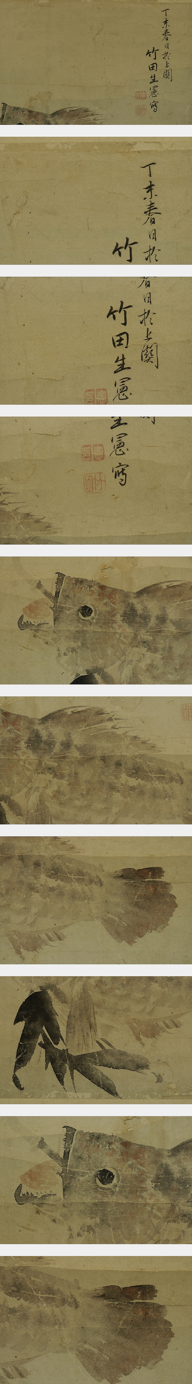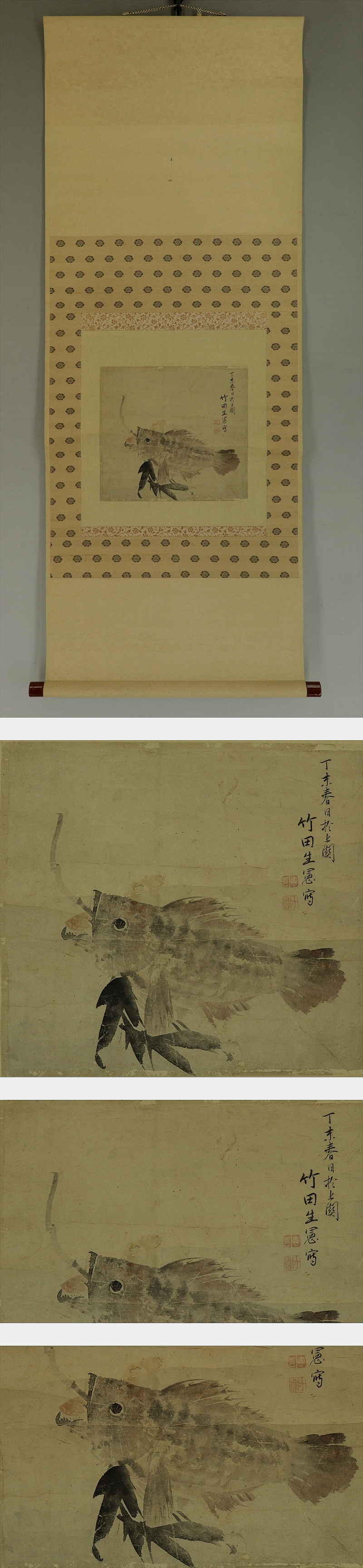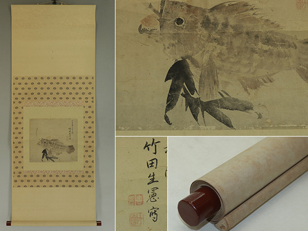 田能村竹田 たのむら-ちくでん(1777-1835) 江戸時代後期の画家。 安永6年6月10日生まれ。豊後(大分県)岡藩医の次男。藩校由学館の頭取となる。 藩内の農民一揆の際,藩政改革の建言がいれられず隠退。 絵を谷文晁らにまなび,繊細な筆致の独自の画風を確立。幕末文人画壇の代表的な作家。 頼山陽らと親交をもち,詩や書にもすぐれた。天保6年8月29日死去。59歳。 名は孝憲。字は君彝。通称は行蔵。 本紙は、染み、汚れ、強い折れ、皺、虫食、破れ、剥がれ、ヤケがあります。 表装は、染み、汚れ、折れ、皺、軸先に少し汚れがあります。 【サイズ】 作品 横約25.5cm×縦約23.5cm 表装 横約44cm×縦約116cm |