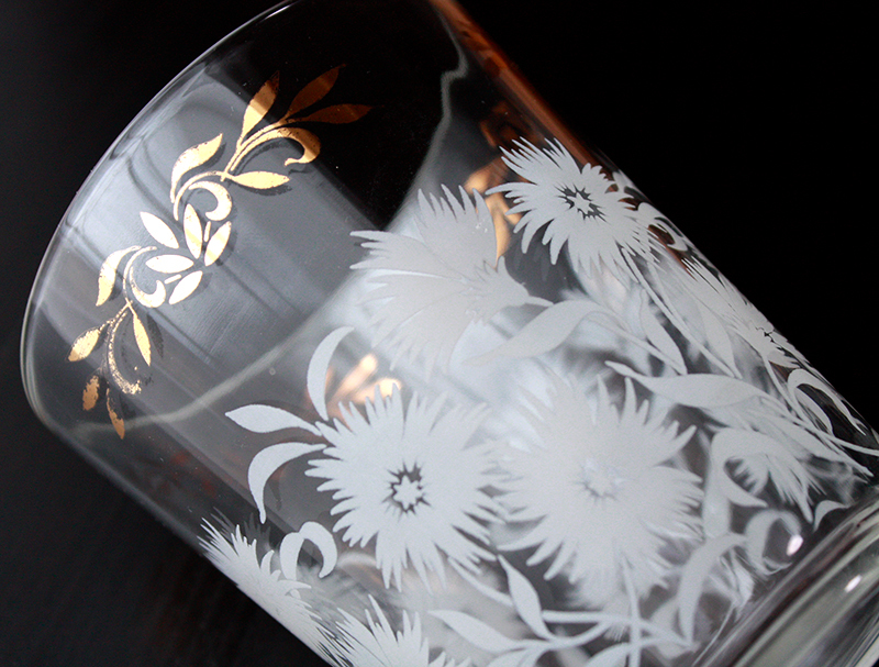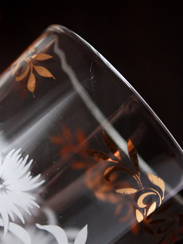 とても緩やかな凹凸がついたビンテージのモールガラスのタンブラーです。味わいのある厚めの古いガラスです。金彩部分に擦れが見られます。経年による小傷があります。約450ml入ります。