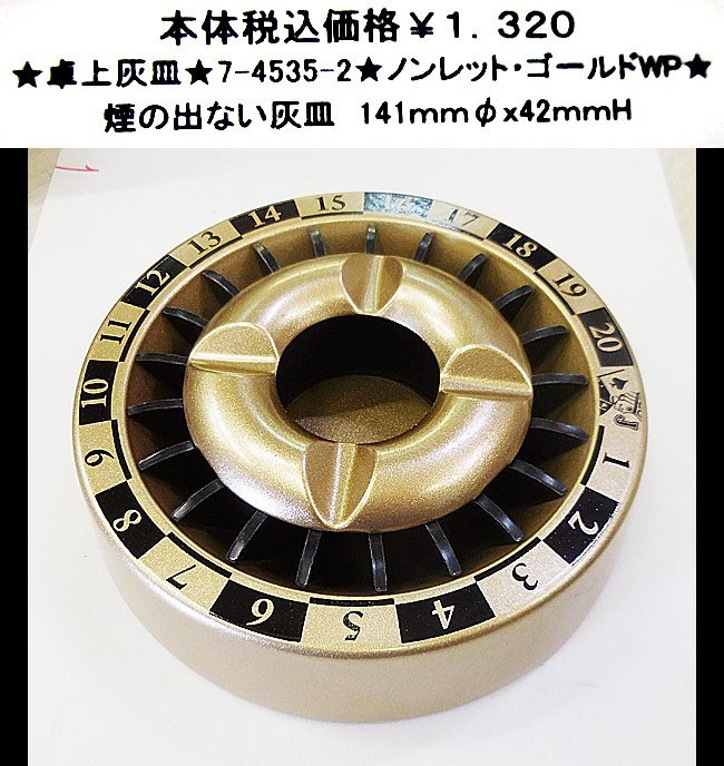 現物を写真撮影、お手元にこの写真の品が届きます。金属製のノンレット・ゴールドWP 煙の出ない卓上灰皿です。2層構造になっており、灰の処理や洗う時に簡単に出来ます。ビンゴが出品している全ての商品は、店頭販売、オークション販売、ショッピング販売等重複し販売しております。時間差で売れ切れや、出荷点検検等で傷が付いていたり破損している事もあります。従いまして、お買い上げ頂きましても出荷出来ない場合も有りますので、予めご了承の上お買い求め下さい。ご注文商品は他商品と同梱配送出来ますので、何個ご注文されても送料は1口分です。1.レターパック発送 ¥600 日時指定不可。(郵便レターパック)。2.宅配便発送税込み ¥880日時指定必須(沖縄/離島は別途価格)。必ず 受取日時 をご指定下さい。(例:15日 18~20 時必着)再配達防止の為。 (業者は当社にお任せ)。3.代金引換発送引手数料税込み ¥1、210 日時指定必須(沖縄/離島は別途価格)。 必ず 受取日時 をご指定下さい。(例:15日 18~20 時必着)再配達防止の為。(業者は当社にお任せ)。