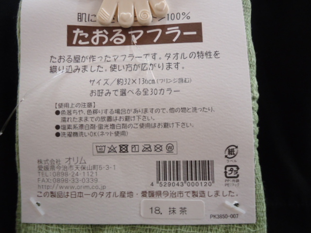 たおるマフラー 抹茶色 18 ★オリム 今治製★ウオーキングに 綿100% UVカット効果あり
