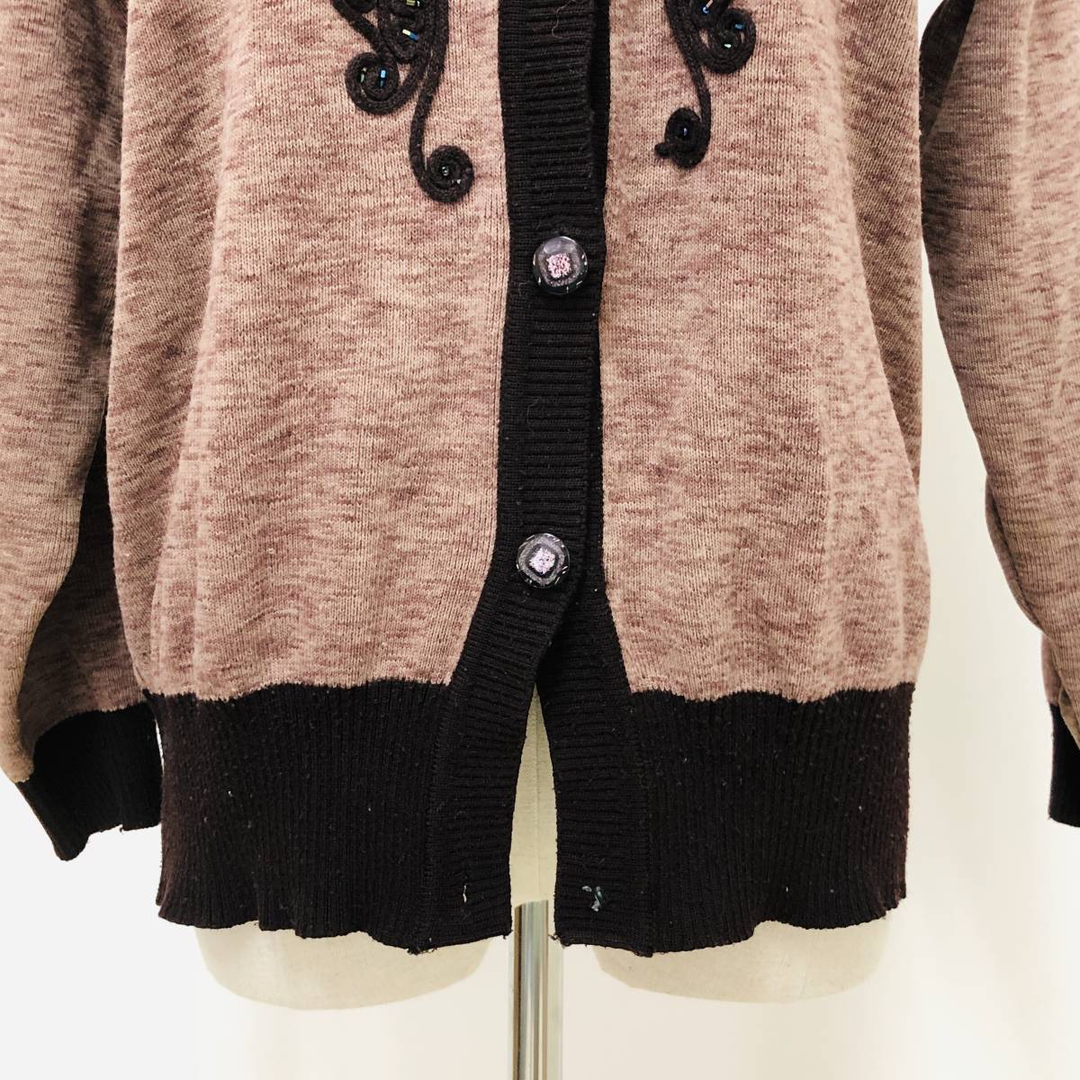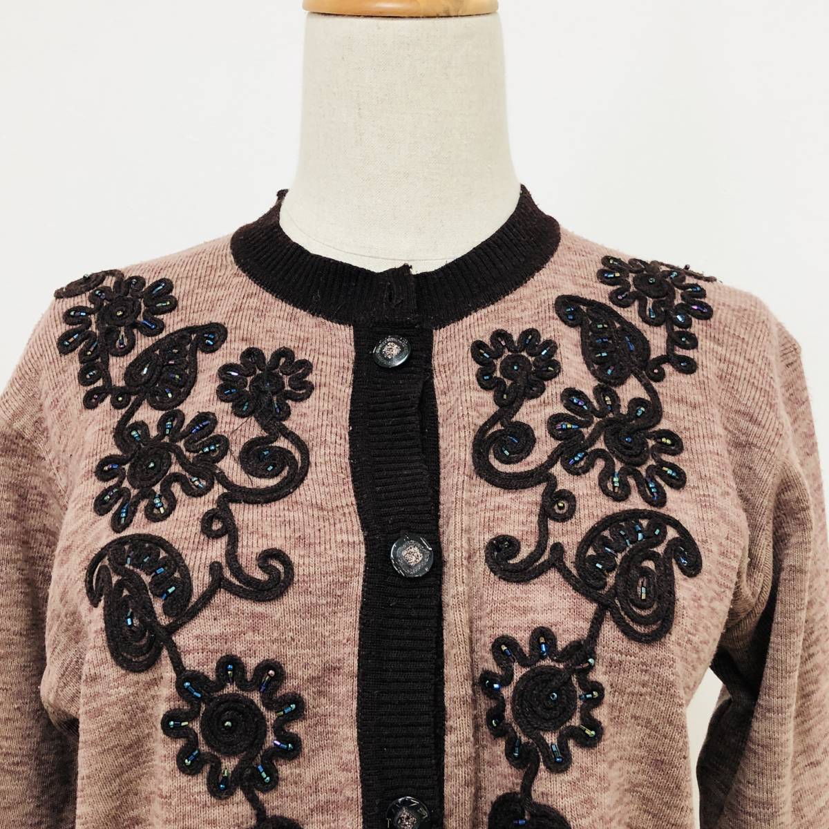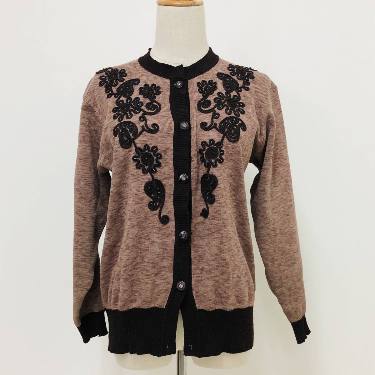 k0405 カーディガン 長袖 毛混 ビーズ M-L ブラウン 花 レディース 昭和レトロ 高級感 上品 上質 おしゃれ 気品 エレガントガーリーチック