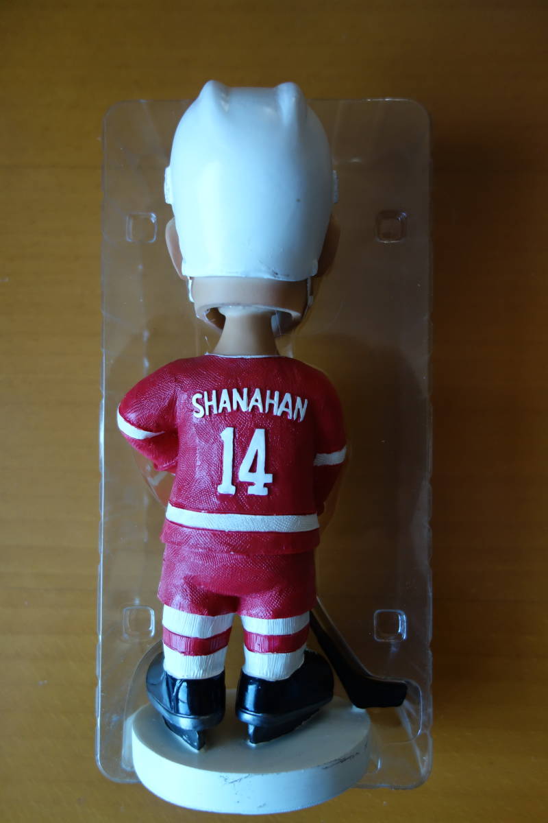 シャナハン選手のレッドウイングス時代のボブルヘッド人形です。光の当たらないところで保管していました。箱から出して飾ったりはしていません。撮影のためだけに開封しました。外箱は経年劣化で、色が少し変化しています。ご理解のうえ、入札頂けますと幸いです。