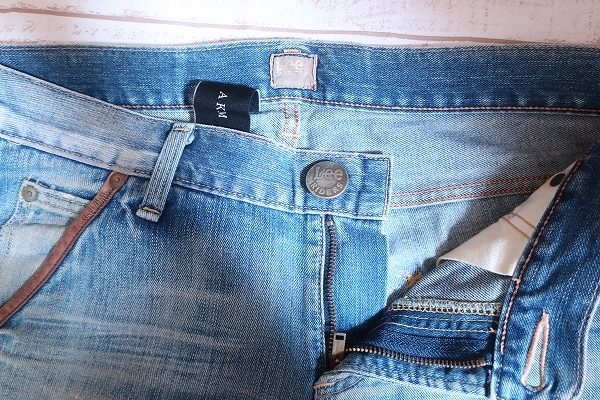 ブランドタグに色あせ、右膝にリペアと裾にスレ、