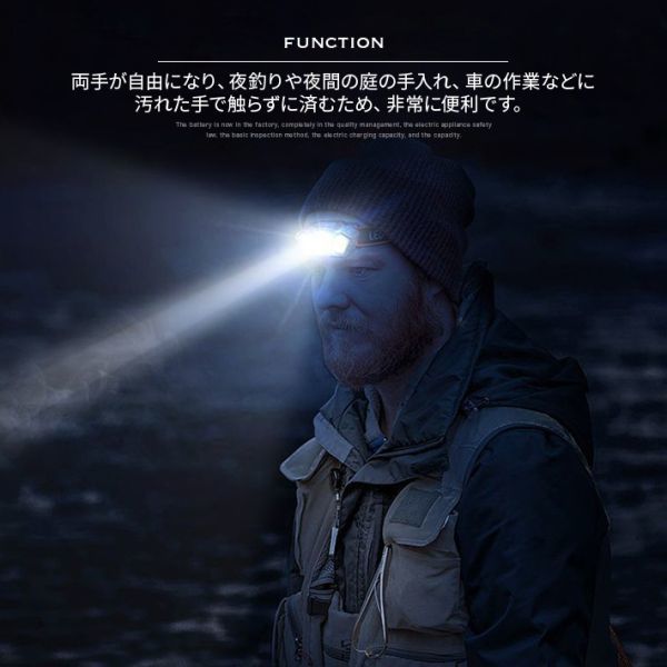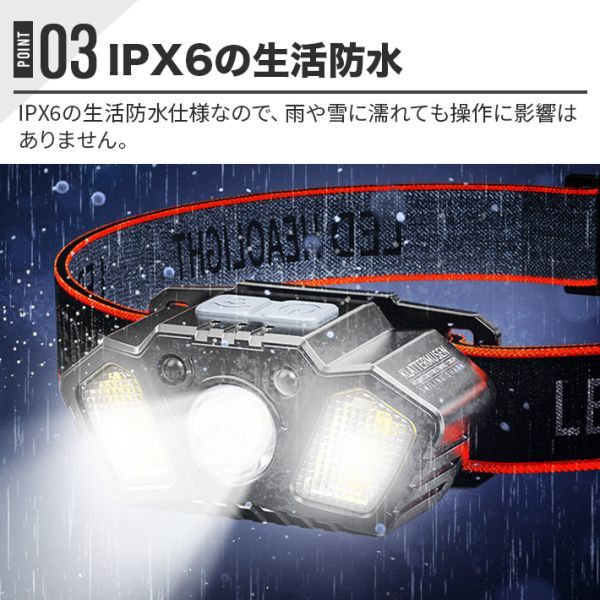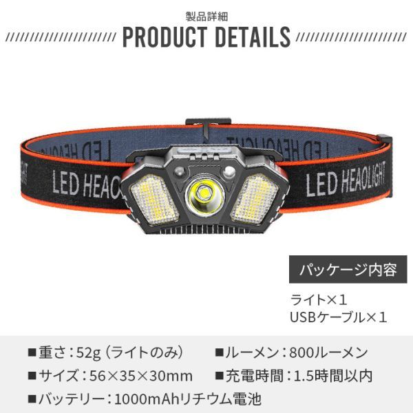 進化版XPE LEDヘッドライト 充電式ヘッドランプ センサー機能5段階調光SOS機能 800ルーメンiPX67 防水 52g 軽量 充電インジケータ