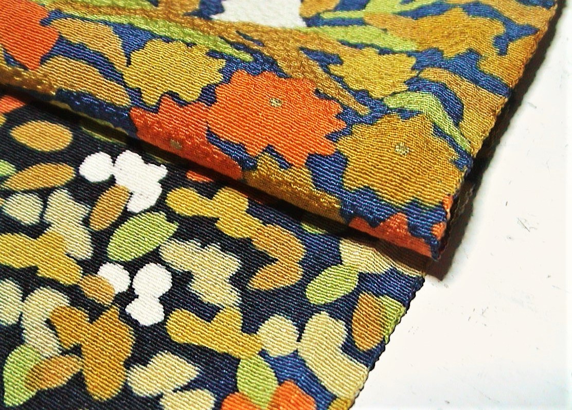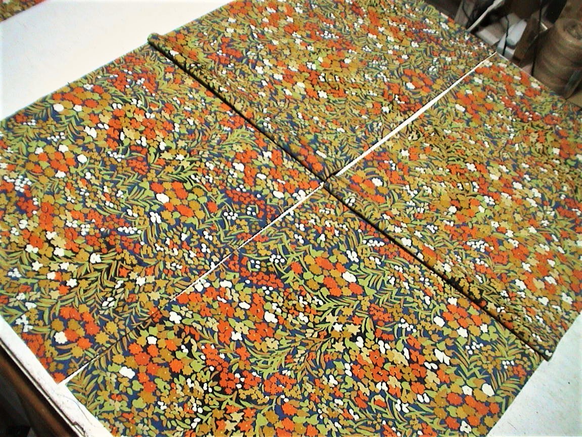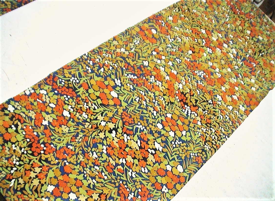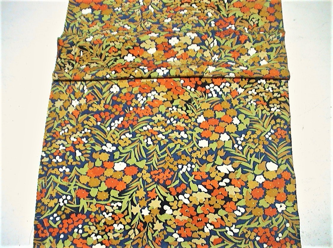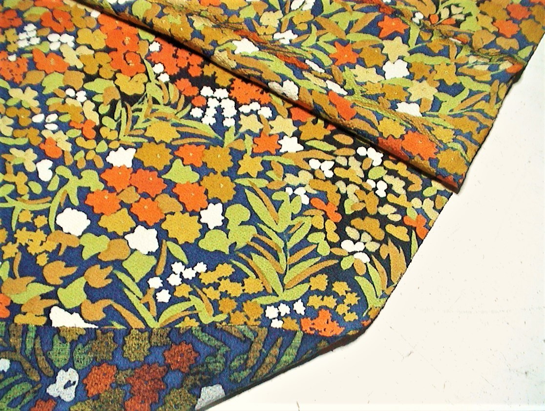 着物はぎれ(古布)正絹縮緬 紺にオレンジ系小花 (36x192cm)