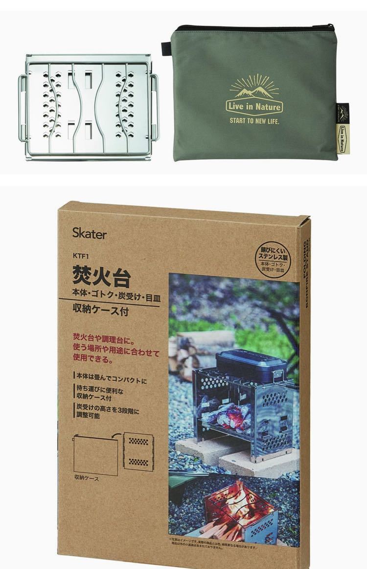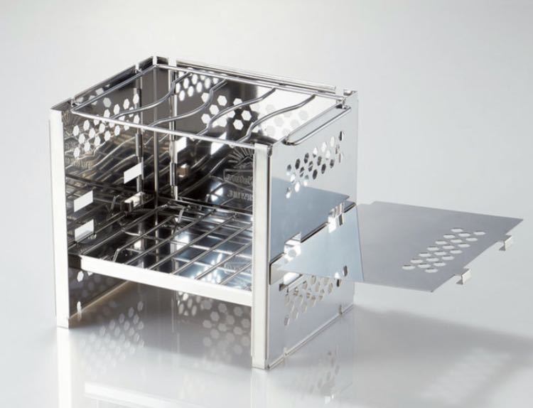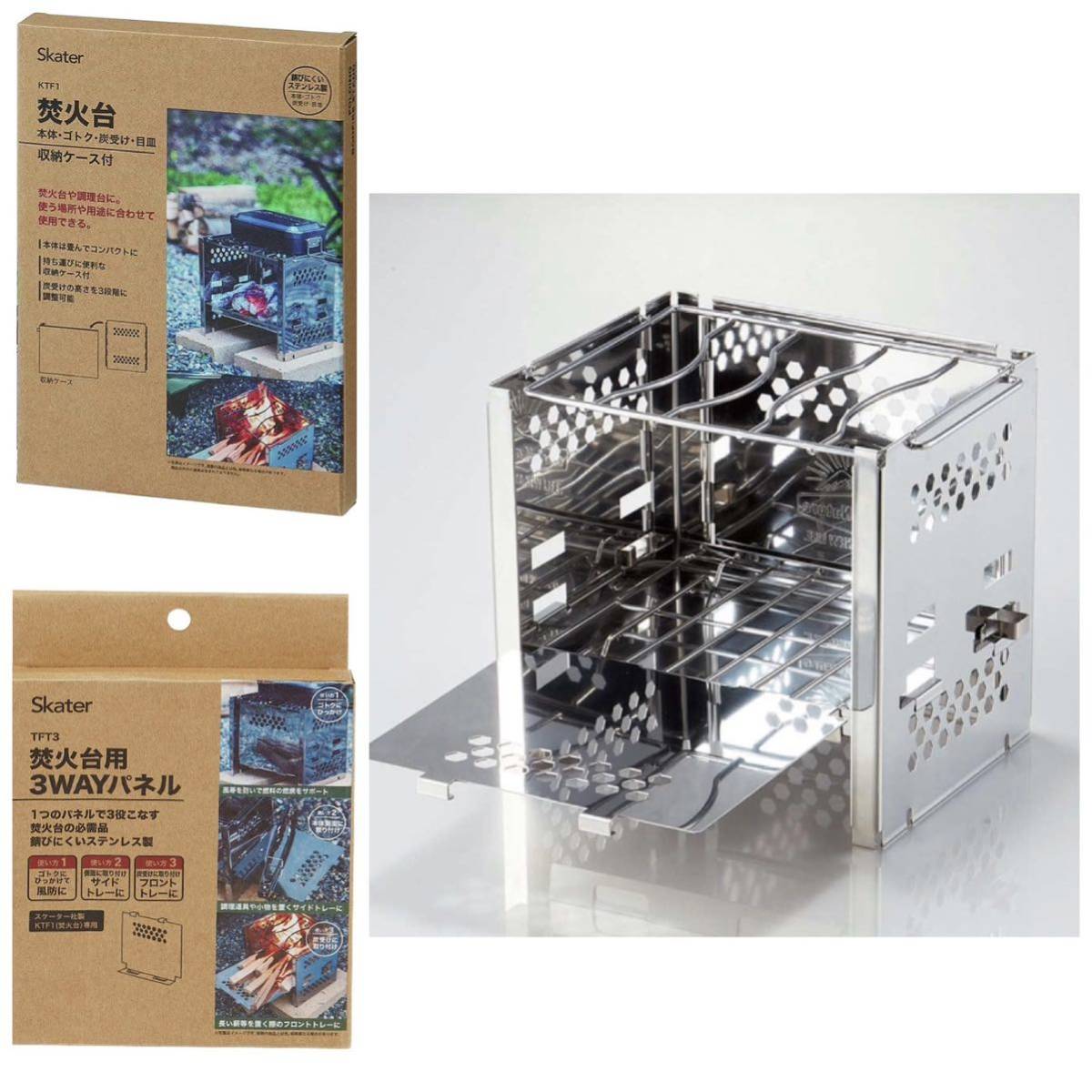 ①一般的なB6サイズグリルよりも奥行があるワイドサイズ焚き火台。ソロキャンプでの焚き火、調理に最適。本体はたたんで収納できるコンパクト設計。炭受けの高さを、3段階に調整可能です