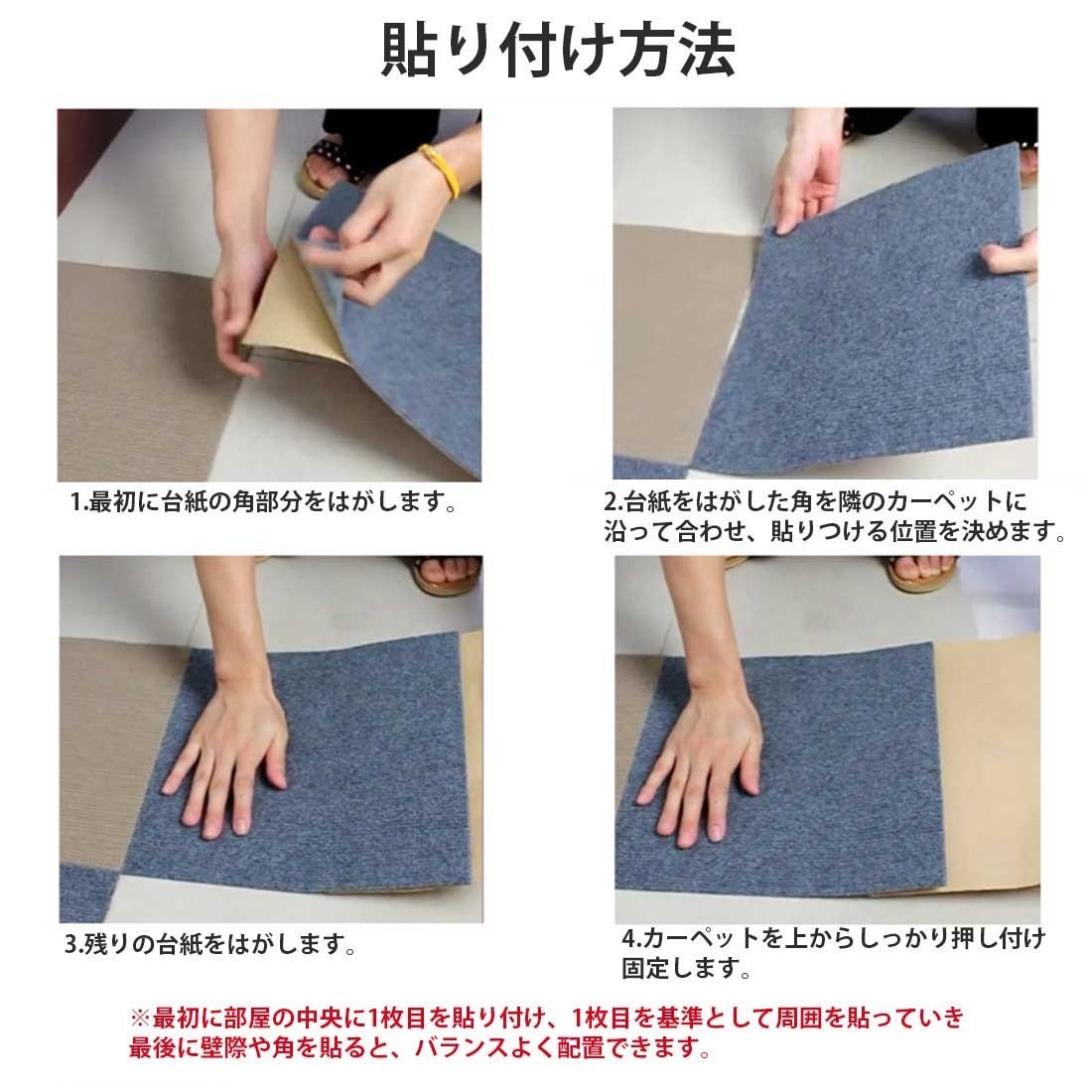 ・気温や湿度の変化でタイルカーペットが伸縮する場合があります。ぴったりと敷き詰めすぎると、伸びた際に突き合ってタイルが浮き上がってしまいますので少し隙間を開けながら敷きこんで下さい。