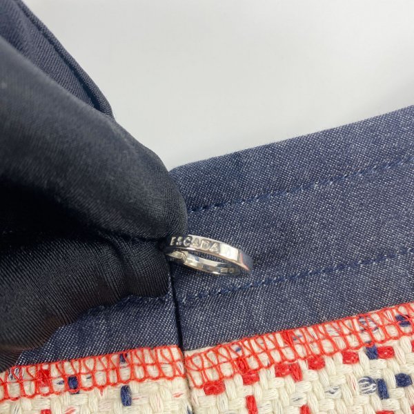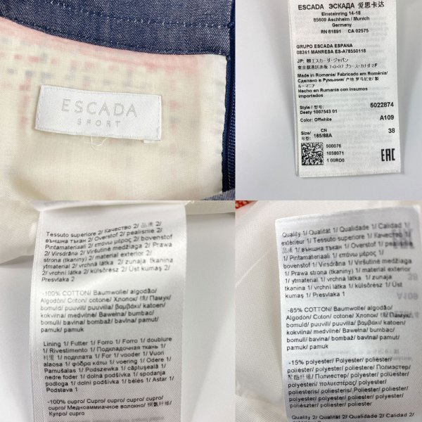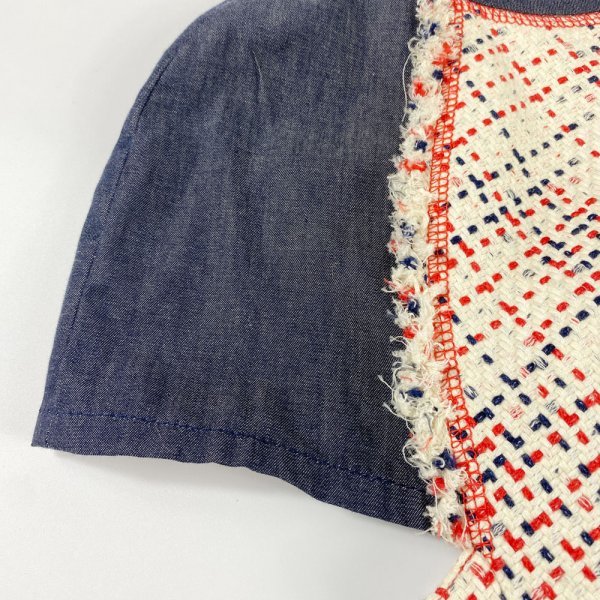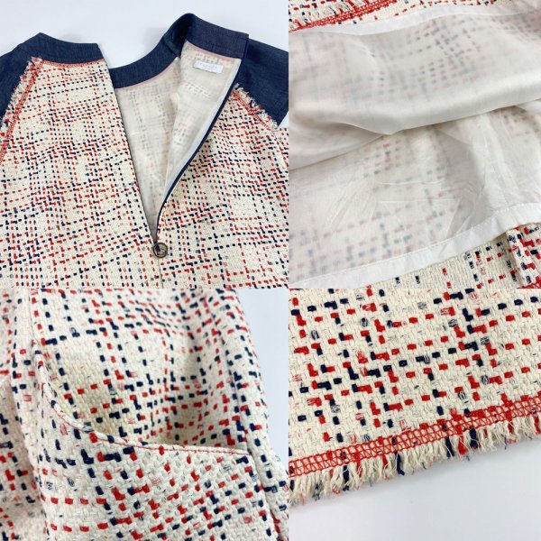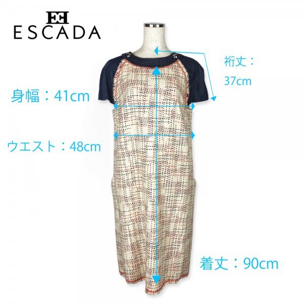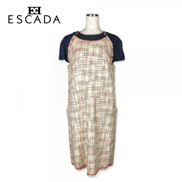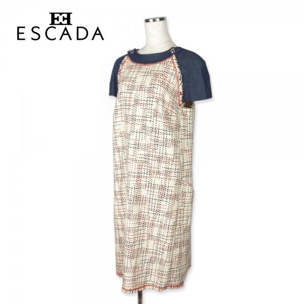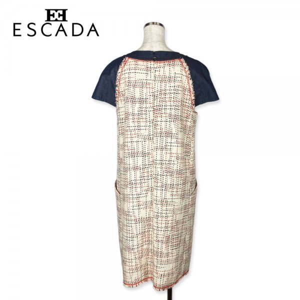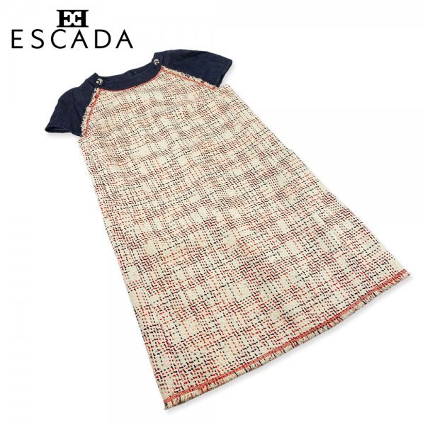 ★美品★ ESCADA エスカーダ トリコロールカラー ツイード ワンピース ルーマニア製 半袖 切替 膝丈 ネイビー レッド 38(Mサイズ) レディース