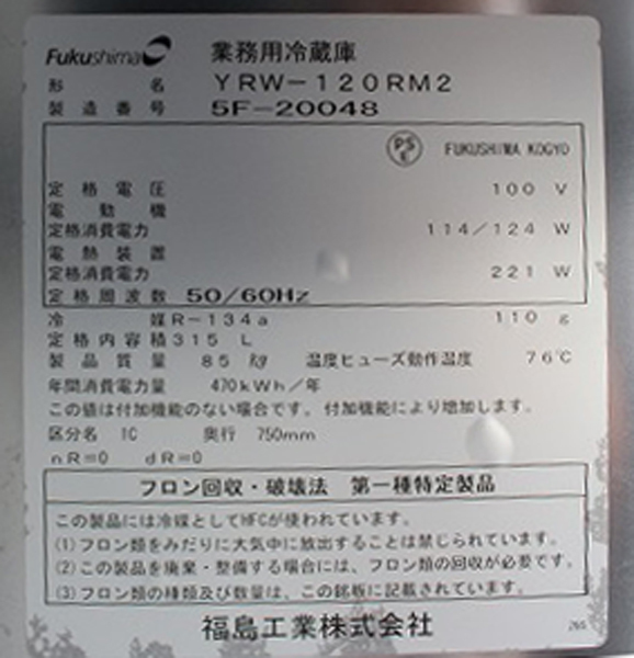 wz9437 フクシマ テーブル型 台下 冷蔵庫 YRW-120RM2 315L 中古 厨房 飲食店 業務用 |