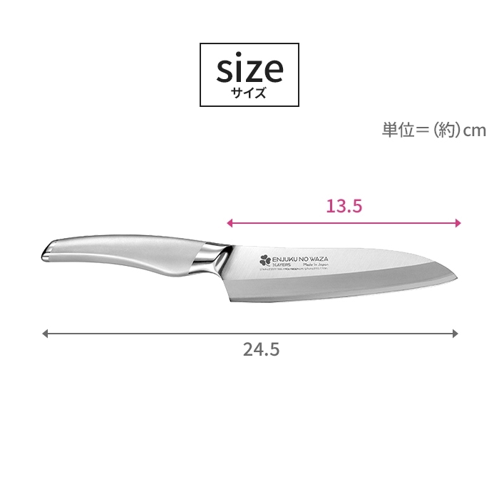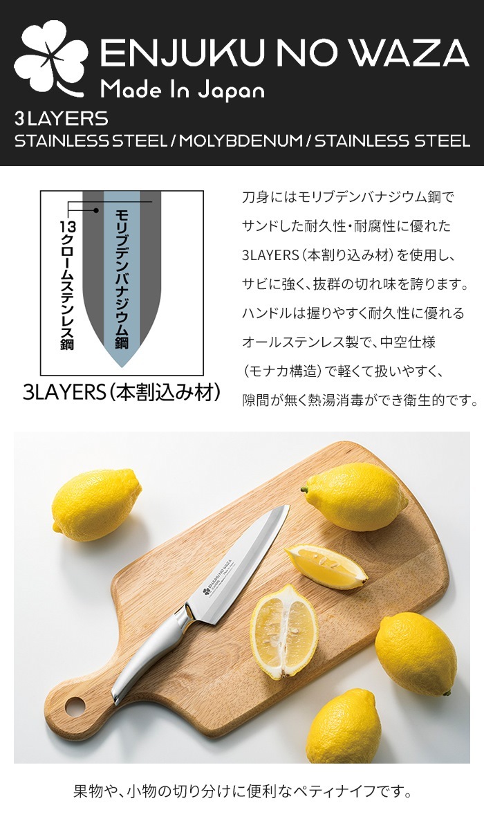 刀身にはモリブデンバナジウム鋼でサンドした耐久性・耐腐性に優れた3LAYERS(本割り込み材)を使用し、サビに強く、抜群の切れ味を誇ります。 ハンドルは握りやすく耐久性に優れるオールステンレス製で、中空仕様(モナカ構造)で軽くて扱いやすく、隙間が無く熱湯消毒ができ衛生的です。 果物や、小物の切り分けに便利なペティナイフです。 |