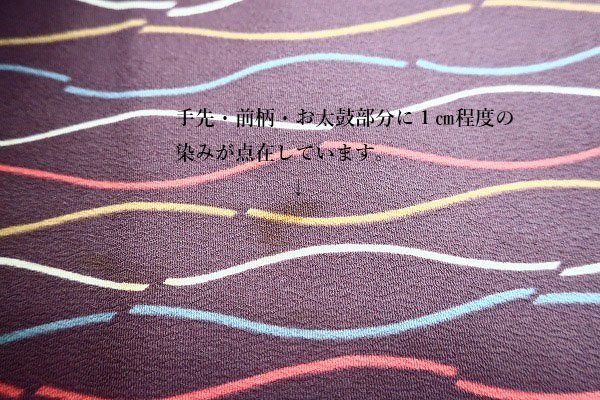| 【表地】Bランク 手先・お太鼓部分に2か所ほど茶染みがありますが着用範囲内です。 |