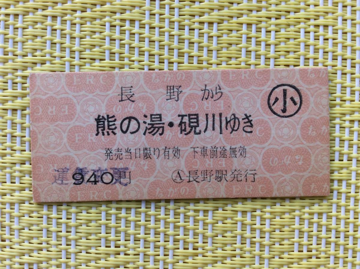 長野電鉄 バス乗車券? 裏面940円 長野→熊の湯、硯川 運賃変更印 小児