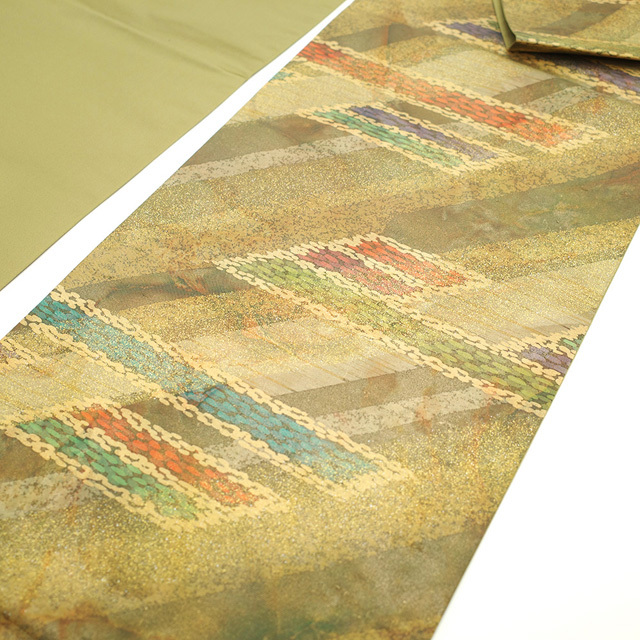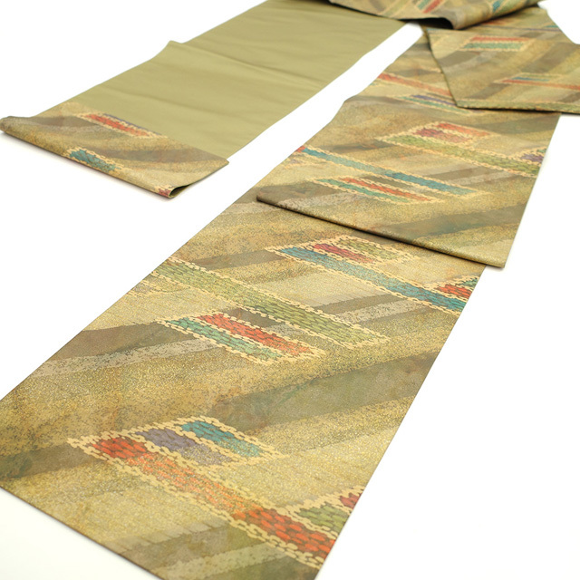 【新古品】 本場牛首紬 袋帯 石川県指定無形文化財 全通 手織り 染め帯 正絹 金彩加工 くすみカーキ色 斜め縞 霞 帯 袋帯 カジュアル 普段着 お出かけ 販売 購入 美品 リサイクル 綺麗 未使用 新古品 仕立て上がり みやがわ sb52036