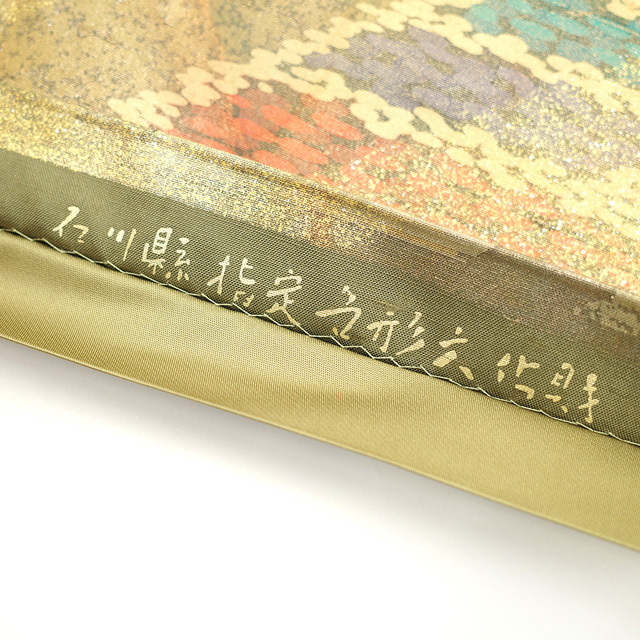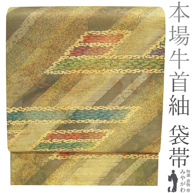 本場牛首紬 袋帯 石川県指定無形文化財 全通 手織り 染め帯 正絹 金彩加工 斜め縞 霞 カジュアル 新古品 仕立て上がり みやがわ sb52036