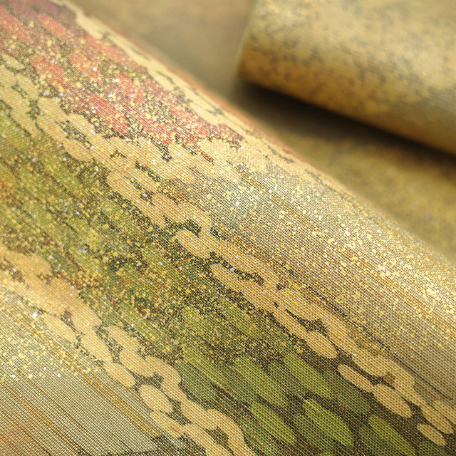 また、味わいあふれる紬地には独特の節が風合いよく浮かんでおり、金彩加工が施されたことによりハリが生まれ、そのハリがお太鼓を美しく形作ってくれます。