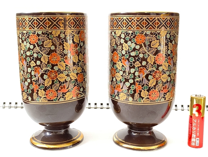 レトロ EXCELENT コップ 2個セット 鳥 植物 花柄 ブラウン×ゴールド 食器 グラス アンティーク ヴィンテージ 同梱可