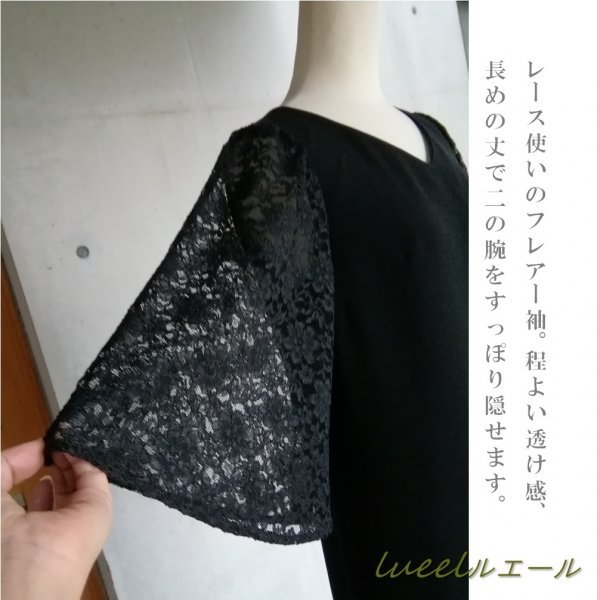 肘までの袖丈感、二の腕をすっぽり隠せ、腕が細く見えるフレアーたっぷりのお袖。