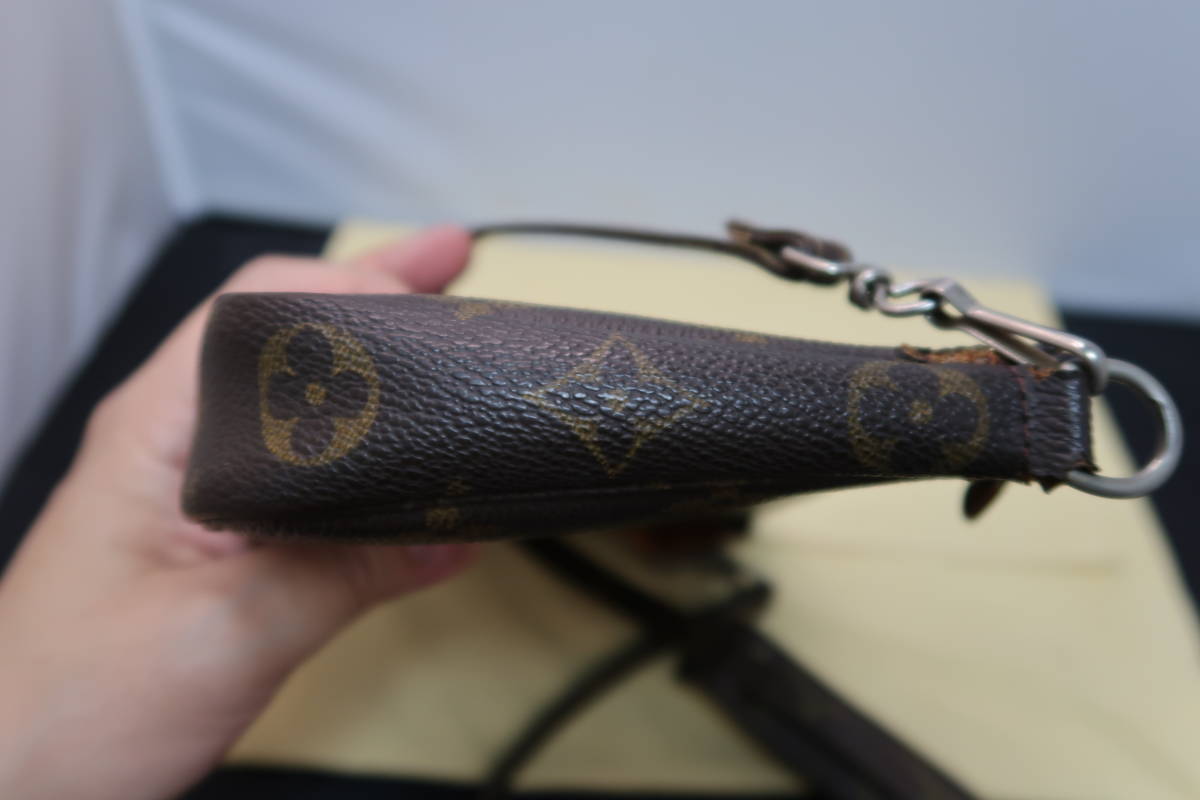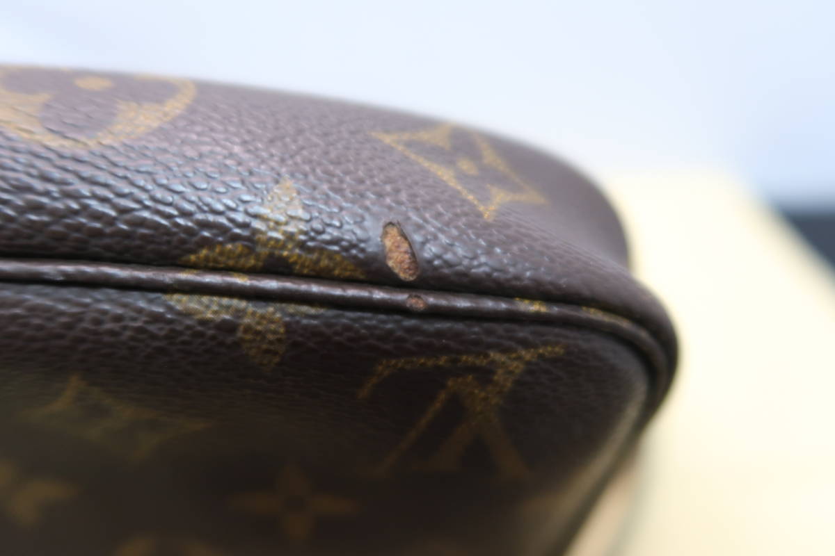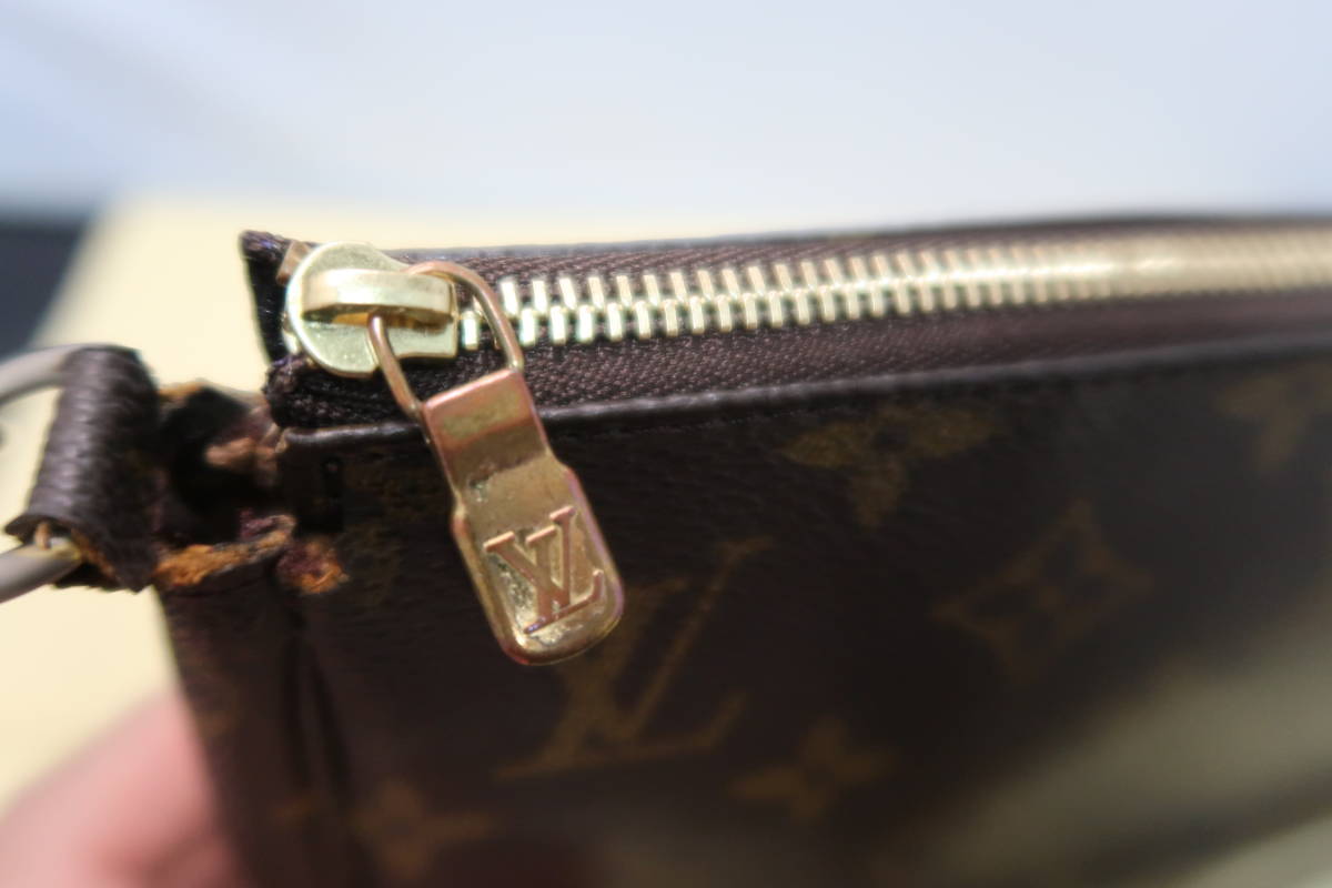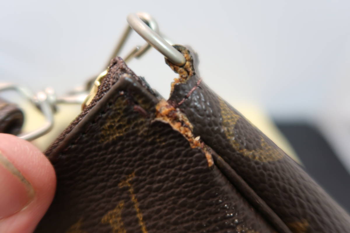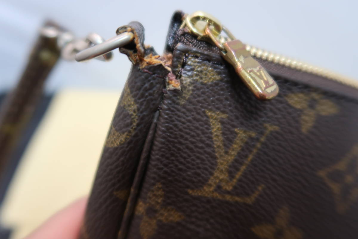 <外側> | ファスナー、スライダーを私が交換しております。引手は純正です。 バッグ底部に溶け跡あります。 ショルダーの付け根の革を補修しております。バッグの開口部に破れが見られます。 全般的に使用感が強いです。 |