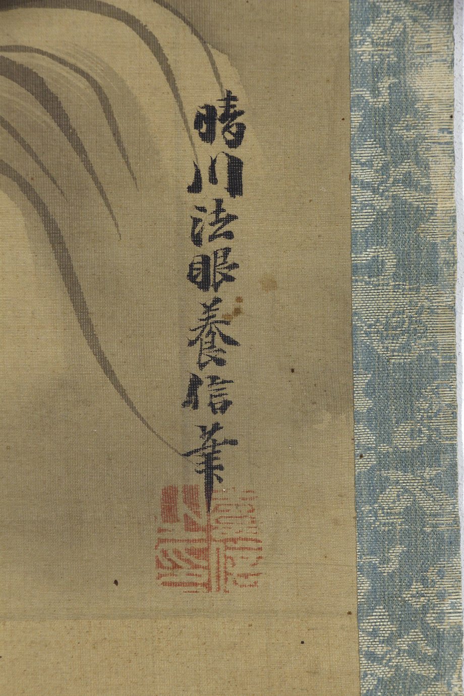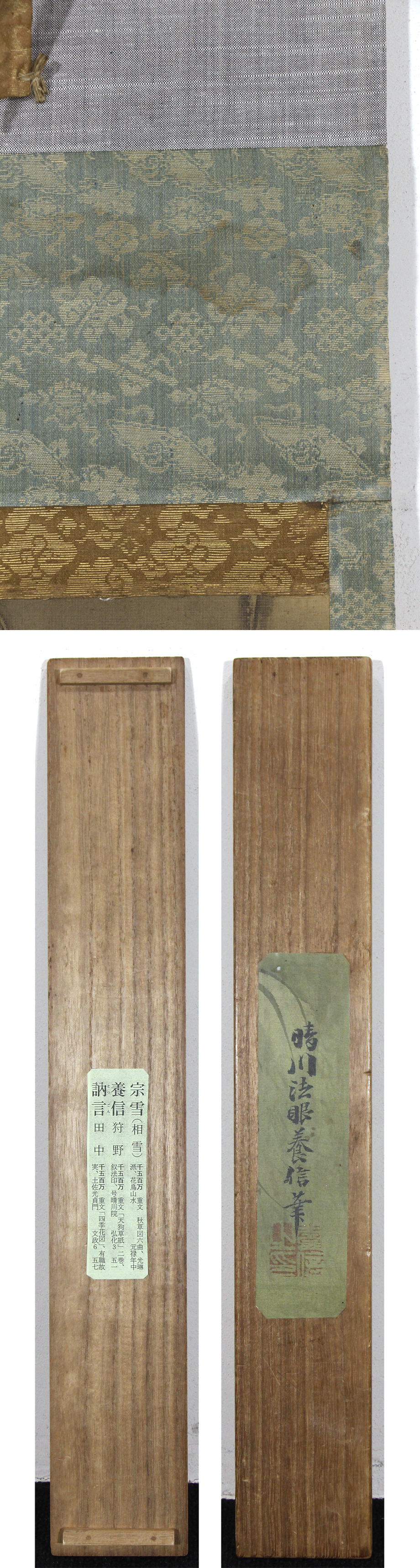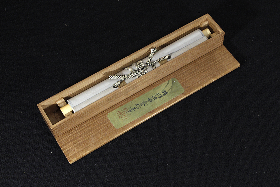 総丈サイズ…横 36 × 縦 153.5 cm 絹本水墨金泥・箱入 【印刷ではありません】 【真作】 狩野晴川院 江戸後期の狩野派の絵師。江戸生。名は養信。通称は庄三郎。会心斎、玉川、晴川院と号す。狩野伊川院栄信の長男。木挽町狩野家九代。江戸幕府奥絵師。画法を父に学び、古絵巻類の模写などを通じて古典的なやまと絵の研鑽を積んだ。文政2年(1819)に法眼、天保5年(1834)法印に叙せられる。江戸城西の丸御殿、ついで本丸御殿の障壁画再建の総指揮を執り、その記録は自身の『公用日記』に詳しい。子に狩野雅信。門下に狩野芳崖、橋本雅邦ら。弘化3年(1846)歿、51歳。 |