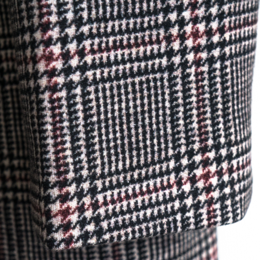 ツイードの風合までもリアルに再現したプリントを全面に施しており、見た目は織り生地と見紛う秀逸さですが、実際はストレッチが効いた柔らかなジャージー素材です。クラシカルなグレンチェック柄ですがジャージー素材を使用することでトレンドある仕上がりに。立体的な表情で、モダンで洗練された印象を与えます。