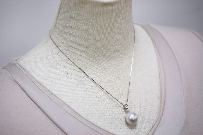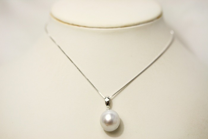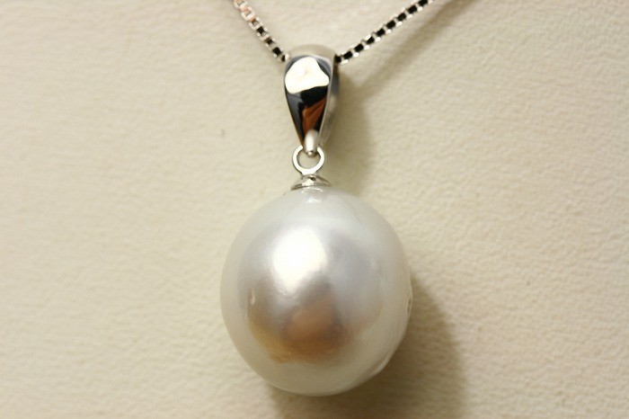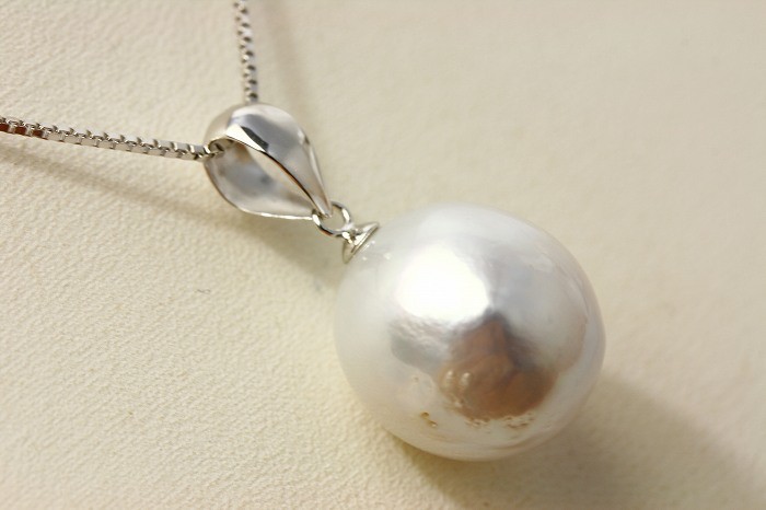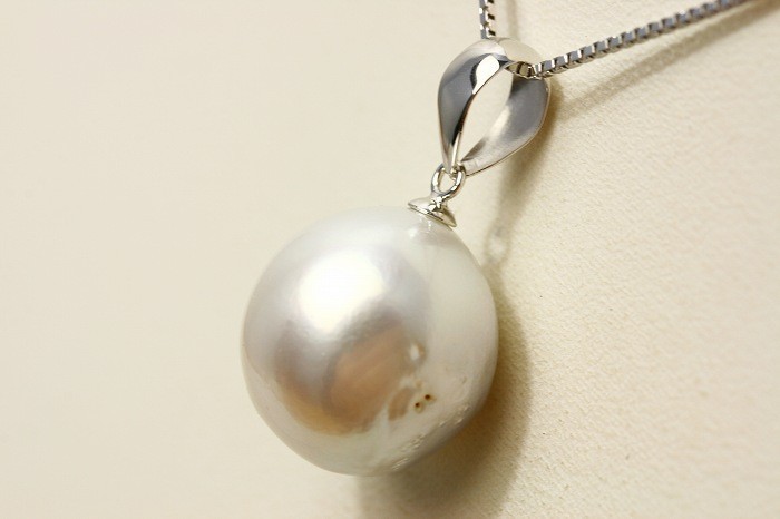 希少な14mmサイズの南洋白蝶真珠ペンダントです。 南洋真珠は約10~12mmサイズの大珠が多くできますが, ここまでのサイズのものは非常に珍しいです。キズは見られます。 上品なホワイトのお色目が出ています。 この一粒を胸元に飾るだけで全体の印象ががらりと変わる一品です。 | |