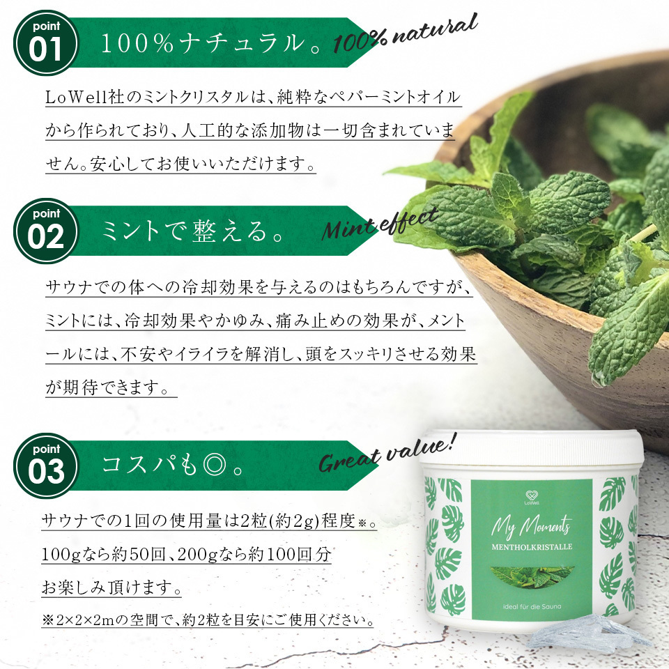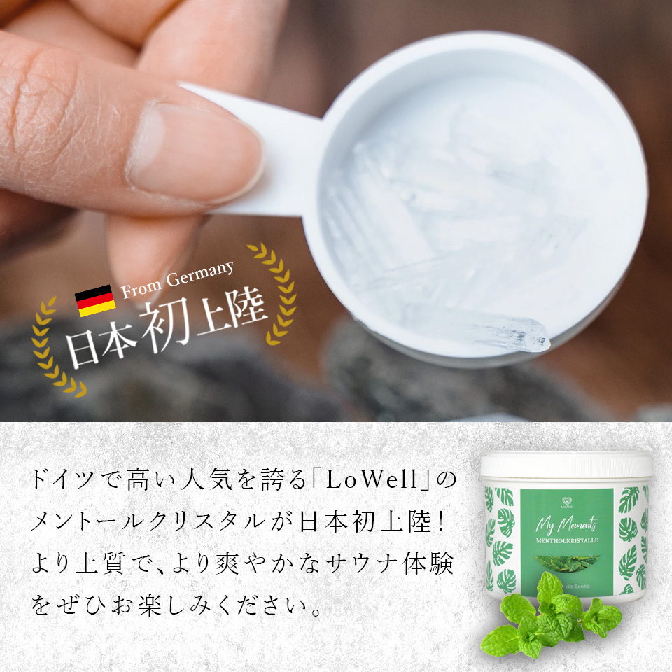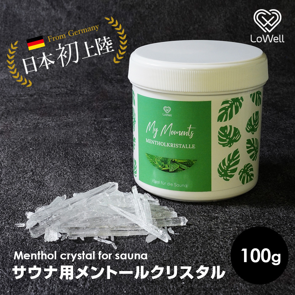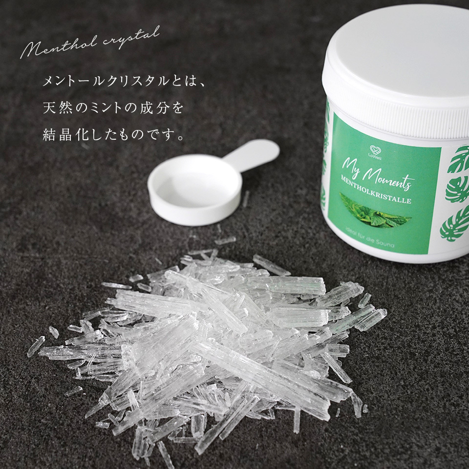 ドイツで絶大な人気を誇るLoWellのメントールクリスタル。熱したサウナストーンの上にこのクリスタルを溶かした水を注ぐことで蒸気に爽やかなメントールの香りが満たされます。メントールには冷え性や痛みを和らげる効果が期待されています。あなたのサウナ体験をより上質な体験に仕上げてくれます。内容量は100グラムです。