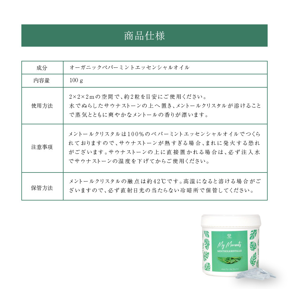 メントールの結晶は100%のペパーミントエッセンシャルオイルで製造されているので、サウナストーンが70℃以上の場合発火する危険があります。サウナストーンの上に直接置かれる場合は、必ず注入水でサウナストーンの温度を下げてご使用ください。