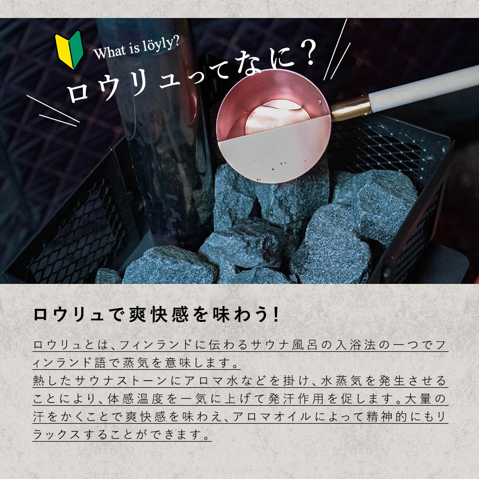 約2×2×2mのサウナテントであれば約2粒サウナストーンの上に置いて香りを楽しみます。お手持ちのサウナのサイズに合わせて使用量を調節してください。また注入水に溶かしてもご使用頂けます。