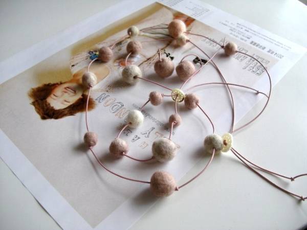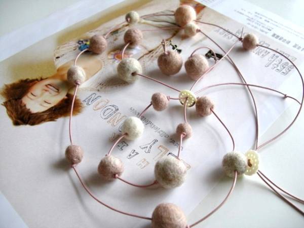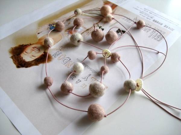 愛らしさの条件・・シリーズです♪フェルト玉マニアⅡ・・ふんわりやさしいフェルト玉のネックレス、ブレスレット、イヤリングの3点セットです♪サーモンピンクやベージュピンクやグレーピンクなどやさしい色のフェルト玉をピンクのレザーコードに紡いでキュートな表情です♪フェルト玉は10ミリから20ミリ位までの大きさ違いです♪ネックレスは100センチ位で調節自由です♪ブレスレットは28センチ位で調節出来ます♪イヤリングは4センチ位です♪それぞれ単品も出品しています♪ハンドメイドをご理解いただいてノークレーム、ノーリターンでお願いします♪