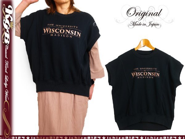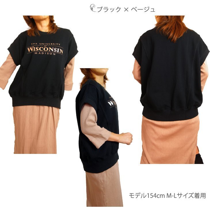 スウェット 半袖 裏毛 レディース 日本製 オリジナル ラバープリント Wisconsin M~L ブラック×ベージュ 新品